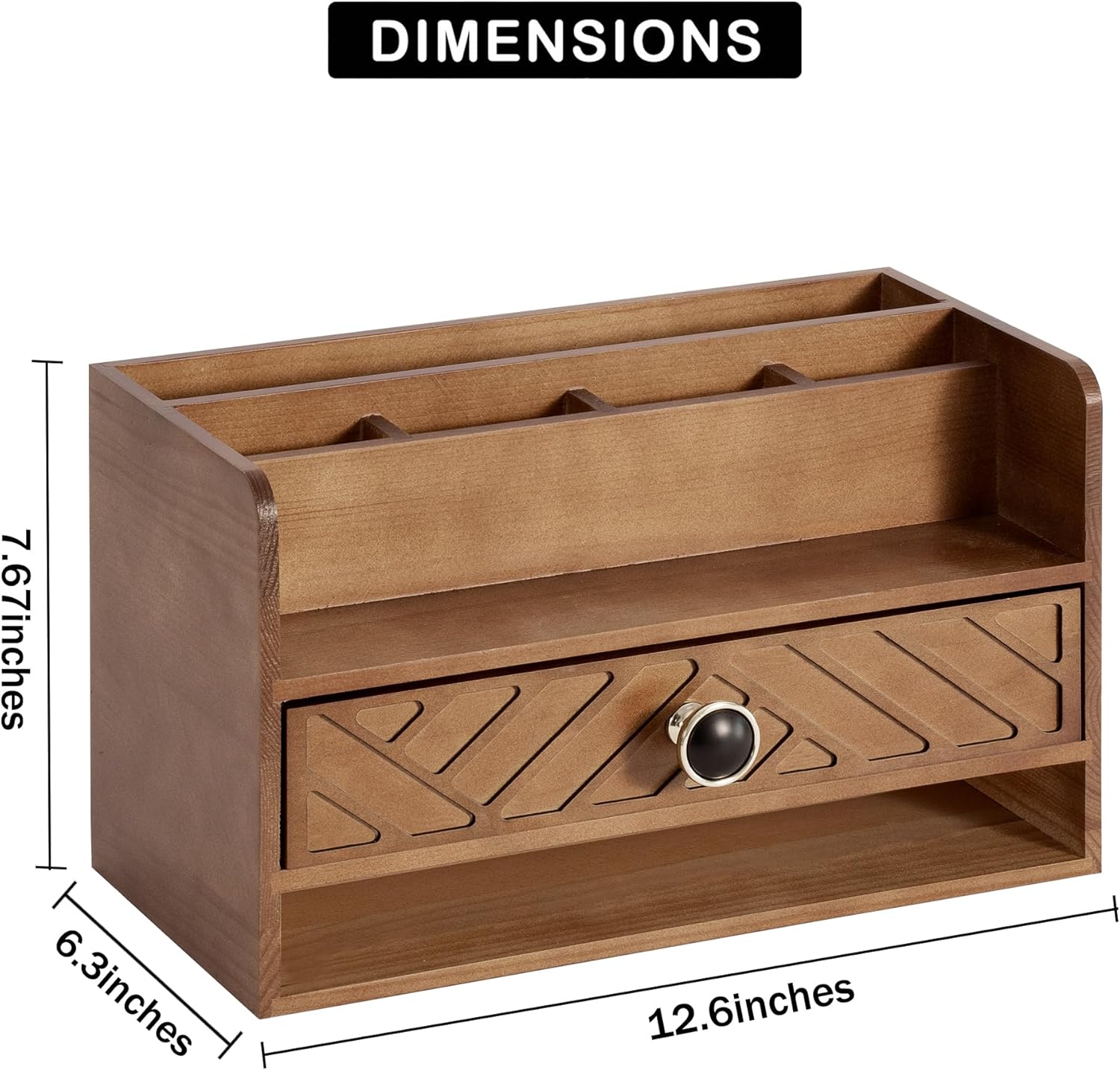 Brown Wood Desk Organizer and Accessories with Drawer, Bill Mail Organizer and File Mail Holder for Office Supplies, Desk Accessories & Workspace Organizers