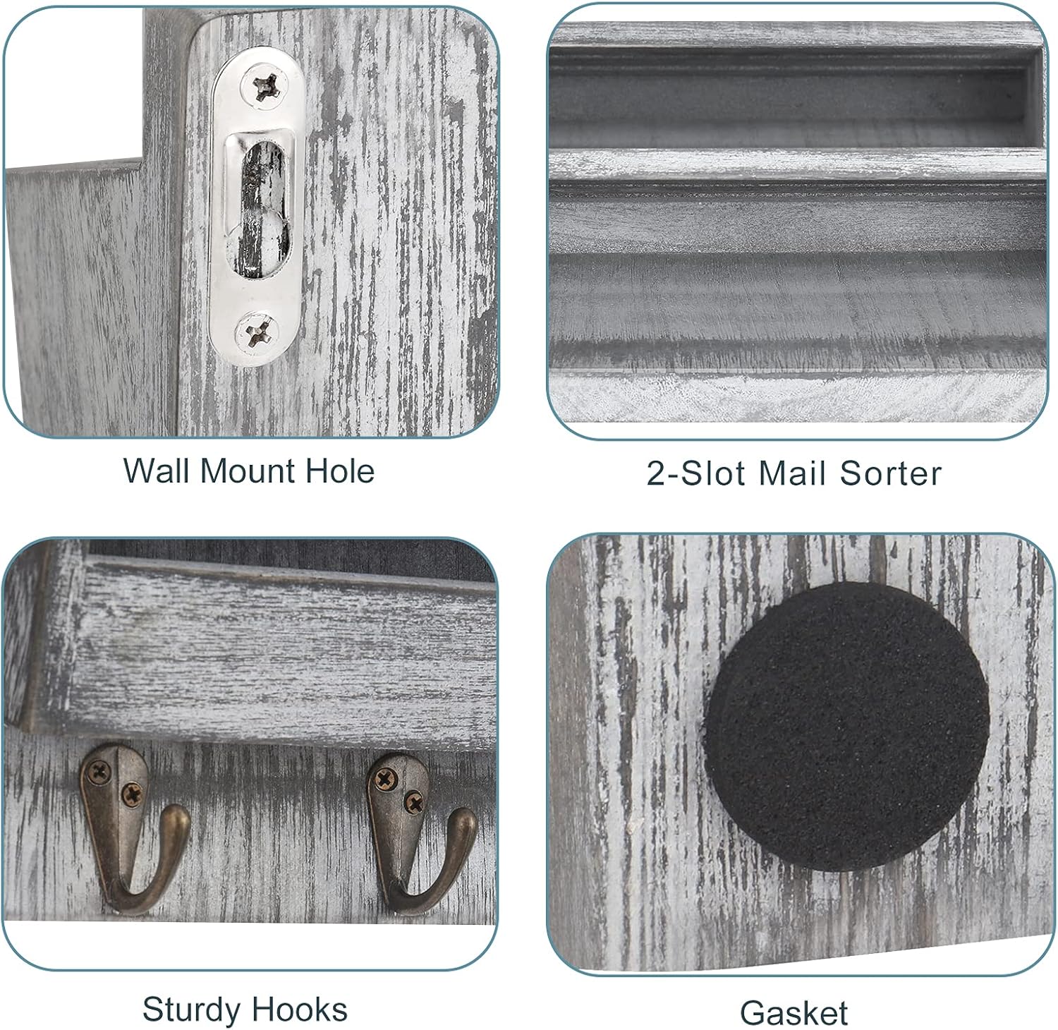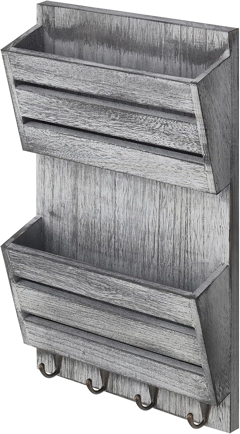 【MULTI-FUNCTIONAL】 Our mail sorter wall mount is designed with your utmost convenience in mind to hold your mail, wallet, bills, letters, and cards neatly organized. Four hooks on the bottom of wooden mail sorter allows you to hang your keys as well as car, sunglasses, dog leash and other lightweight accessories to keep them much more organized and in sight.