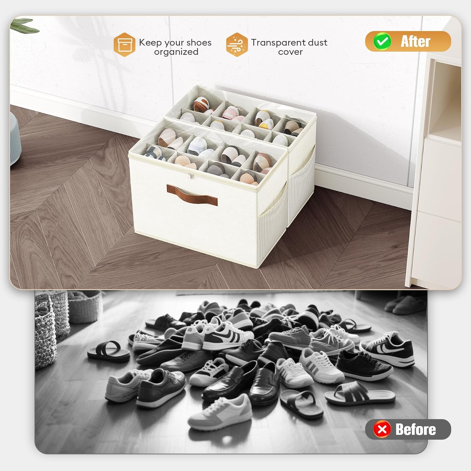 👟ADJUSTABLE DIVIDERS: Customize compartment sizes to accommodate various footwear types or multi-purpose storage needs. Perfect for decluttering shoes, clothing, toys, and other items.