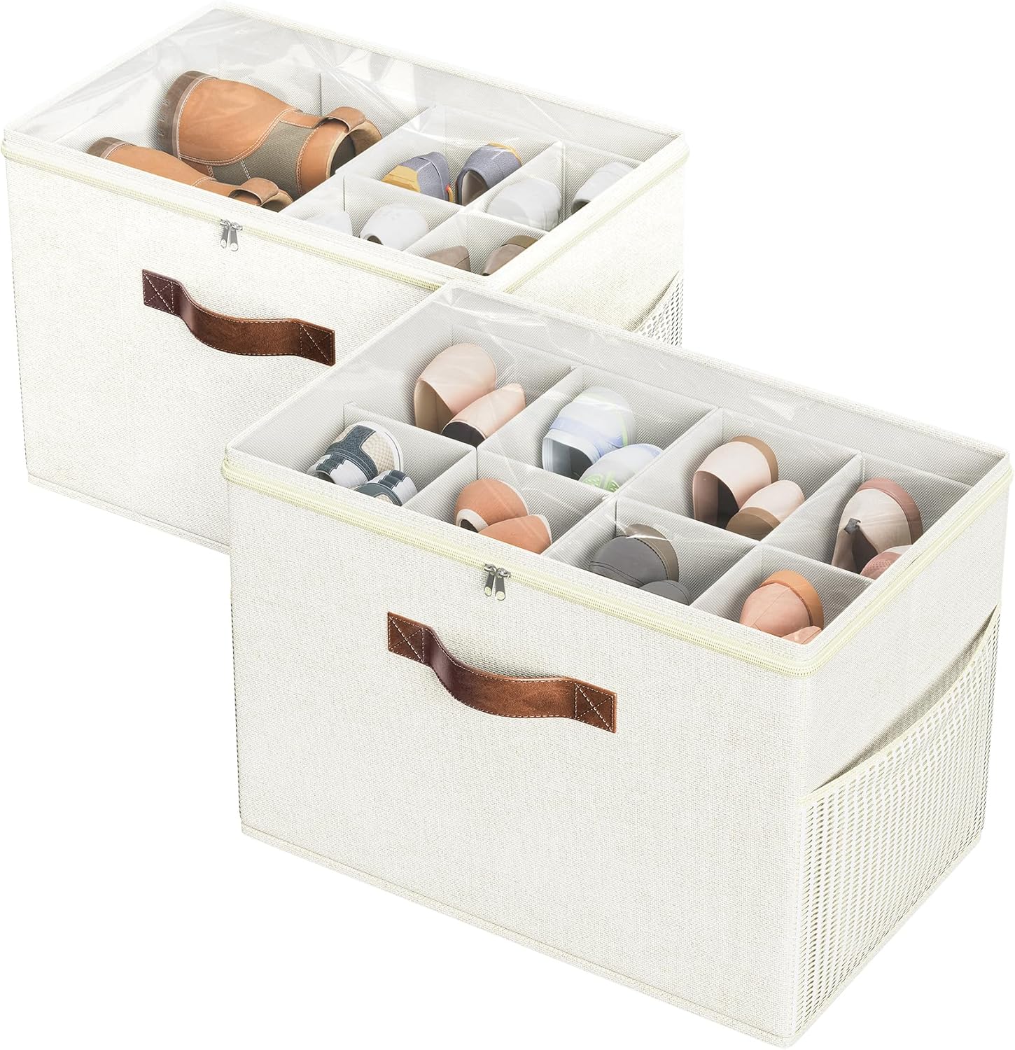 Budding Joy 2 Pack Shoe Organizer for Closet, Clear Foldable Shoe Storage Containers Adjustable Dividers Fits 16 Pairs,Shoe Storage Bins Baskets Boxes with Reinforced Handles Beige
