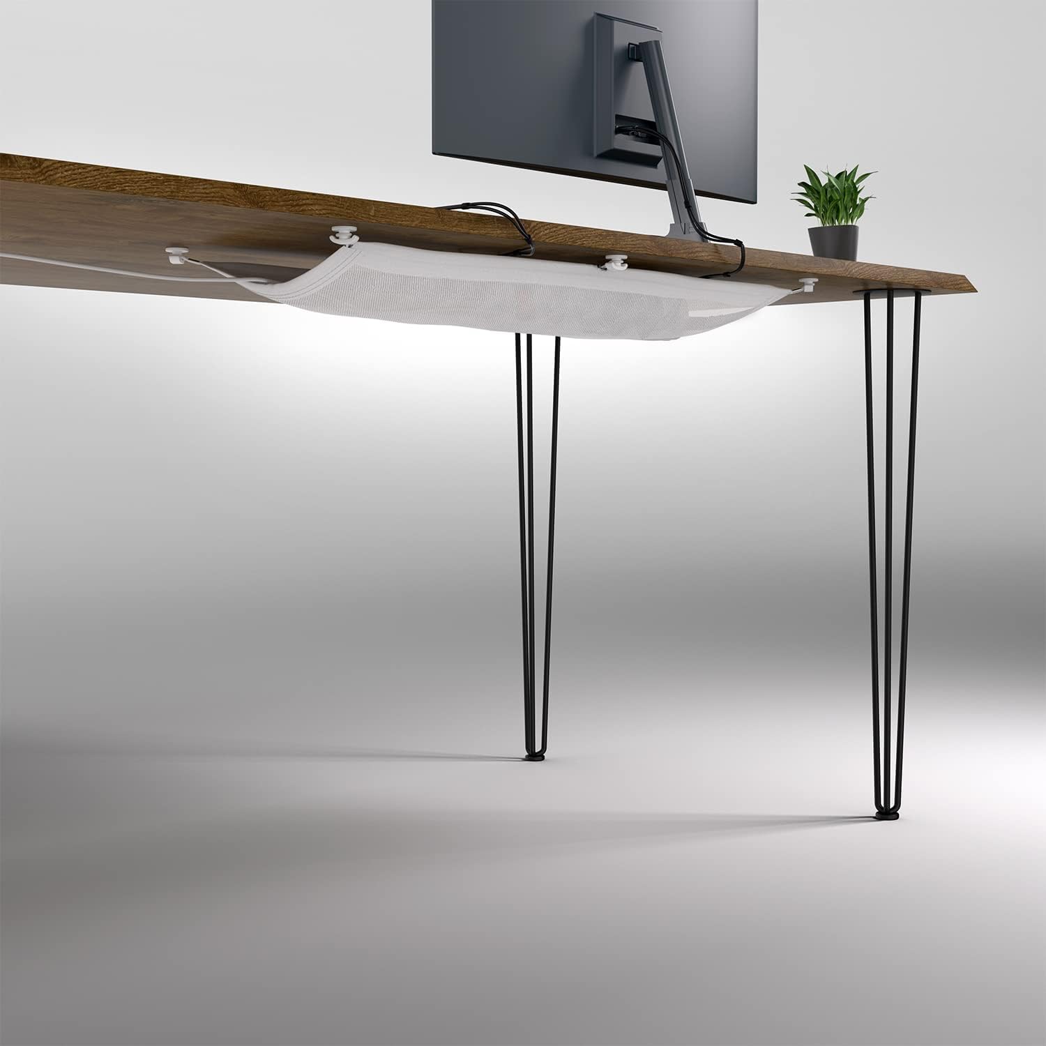 Finally a clean cable management under desk! Organize multiple plugs and wires effortlessly with the smart under desk cable net. Install your flexible cable management tray under desk for your gaming setup or home office.