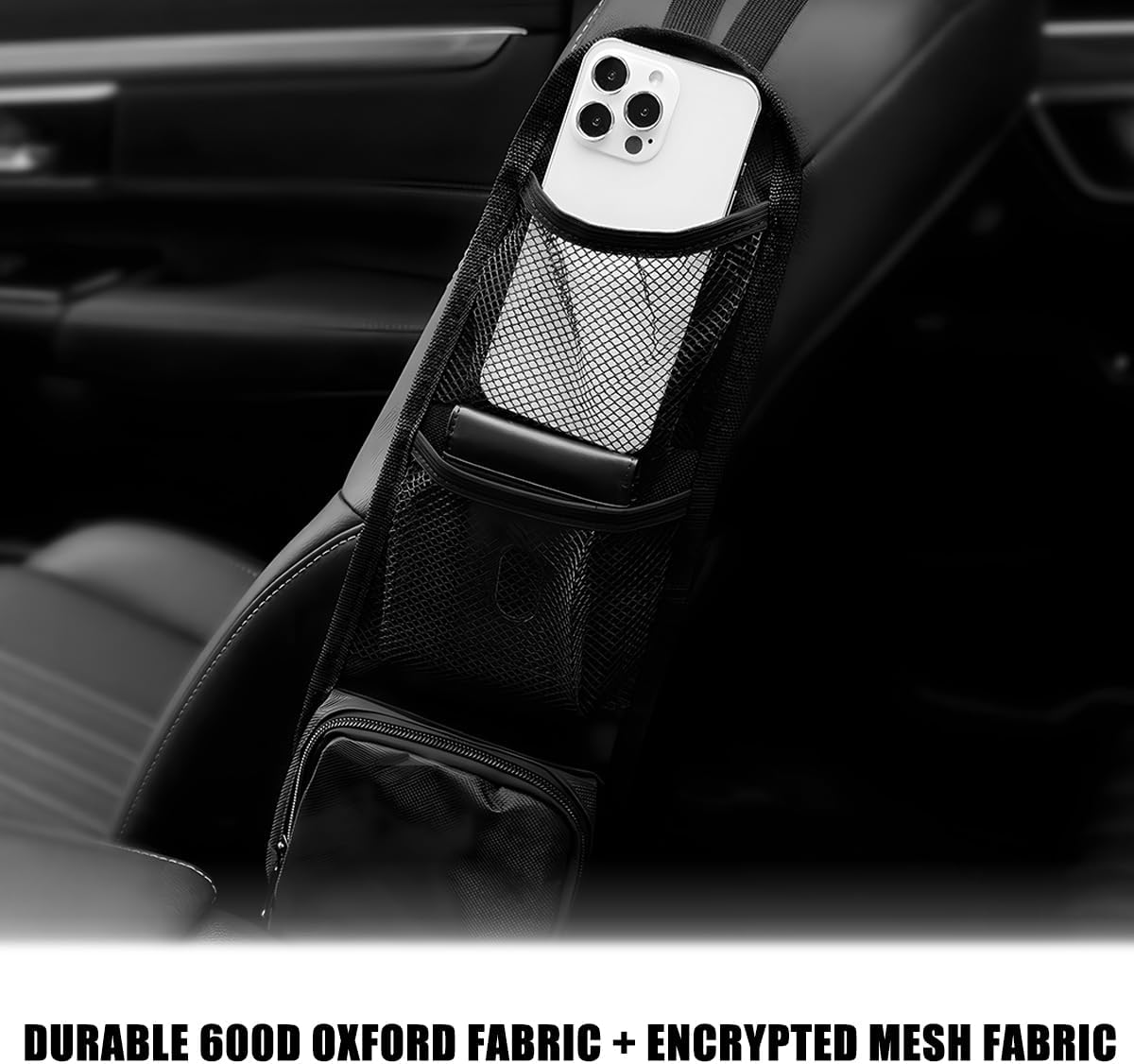 High Quality Material: Our car seat side organizer is made of high quality polyester oxford fabric material. The polyester oxford material has high strength to prevent tears and scratches, and maintains long-lasting performance even after prolonged use. Polyester Oxford material also has good waterproof performance, liquid dripping on the surface is not easy to penetrate.