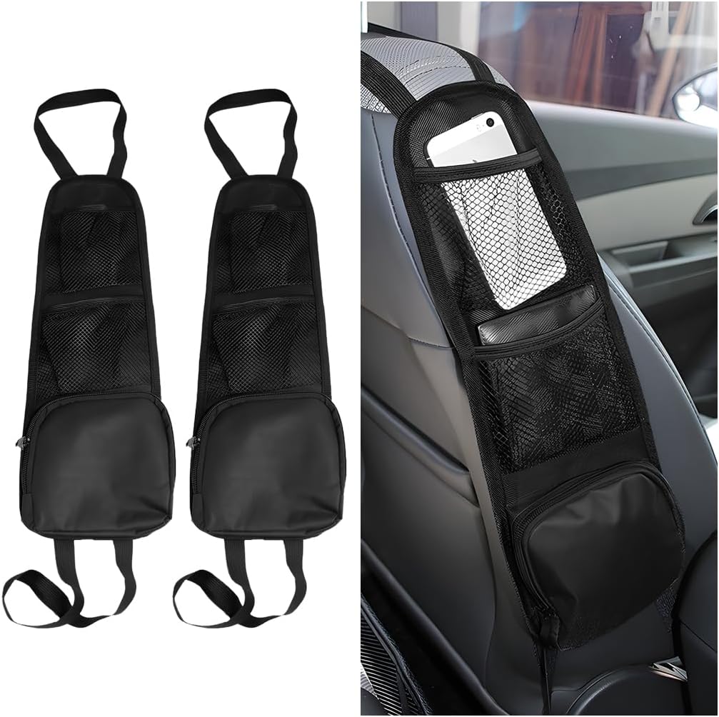 Car Seat Side Organizer, 2PCS Multi-Pocket Vehicle Front Seat Storage Hanging Bag with Mesh Net Pocket, Multifunctional Automotive Stuff Holder, Universal for SUV RV Truck (Black)