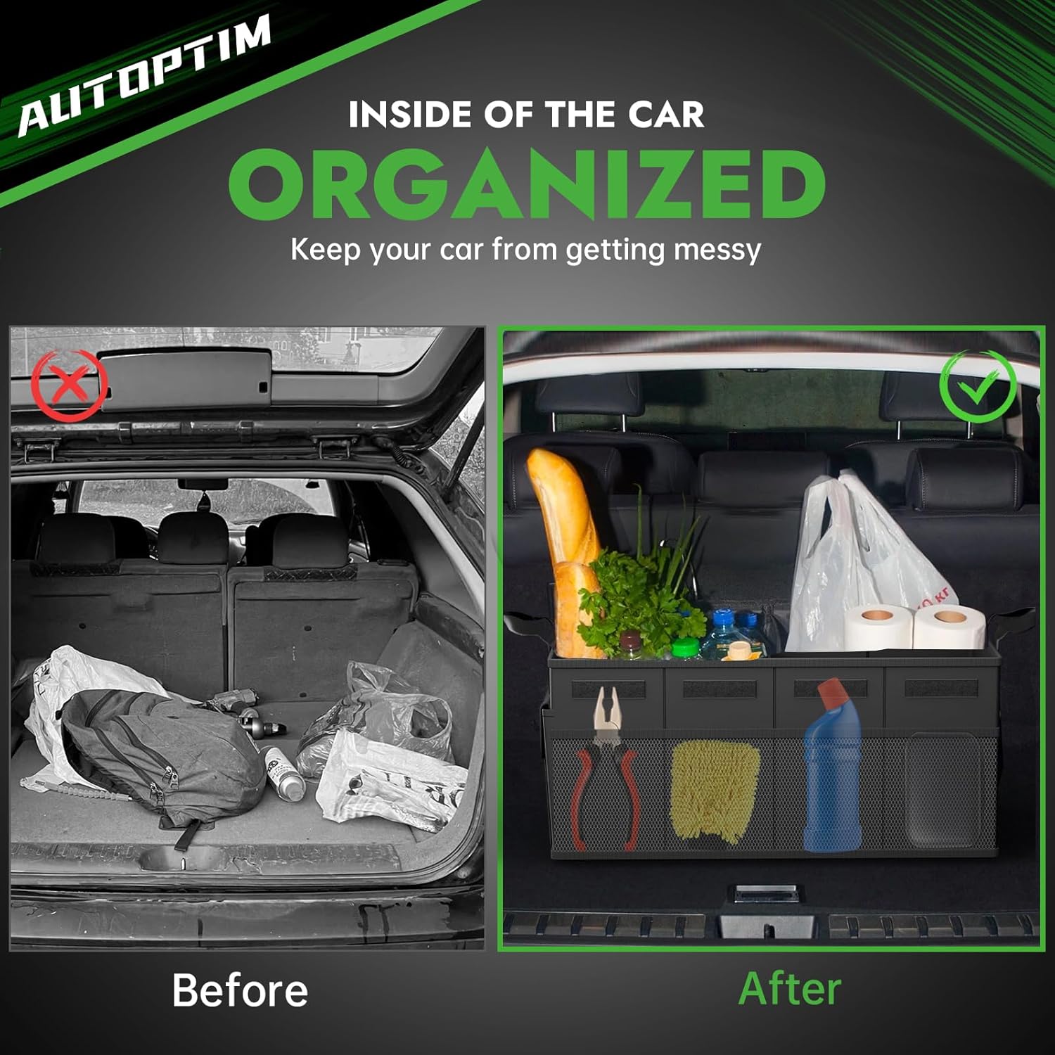 [HOLD IN PLACE]: The bottom of our car organizers and storage features Velcro, which securely hold it in place and prevent items from shifting or spilling while driving. With our car organizer, you’ll never have to worry about a cluttered trunk again.