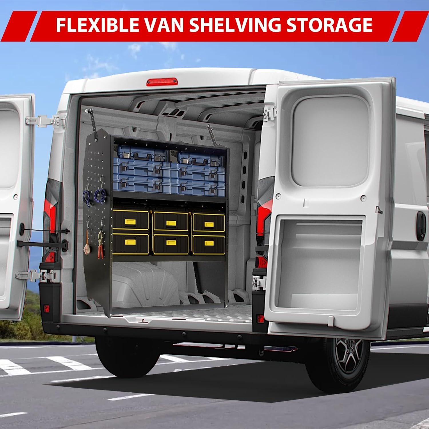 Flexible & Adjustable: The van shelving system features customizable trays and dividers, allowing you to adjust compartment heights and spacing to fit items of any size. This flexibility maximizes storage efficiency, keeps cargo organized, and adapts to both tools and everyday storage needs.
