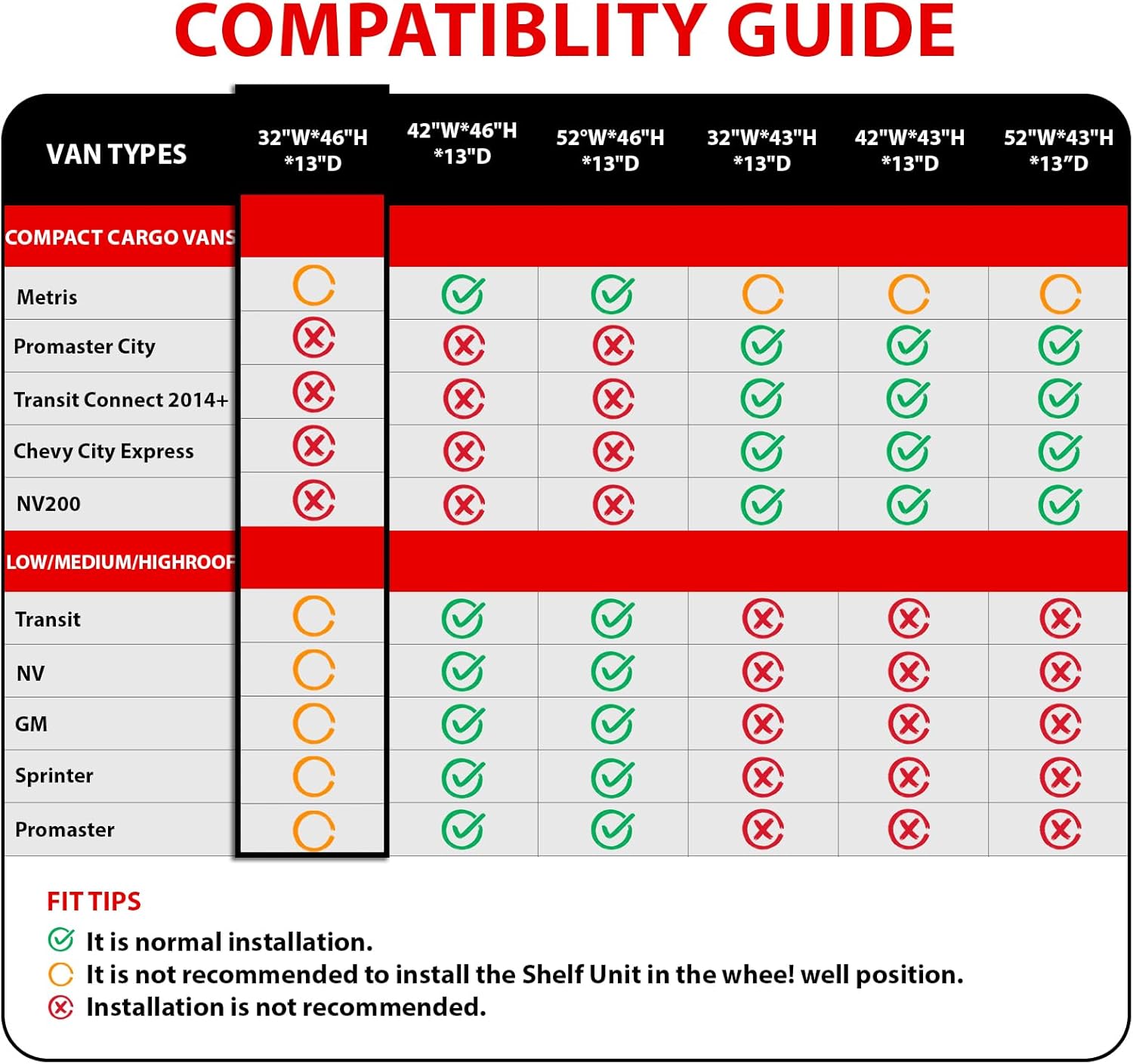 Wide Compatibility: These heavy-duty van shelves fit for Low/Mid/High Ford Transit, Ram ProMaster, Chevy Express/GMC Savana, Nissan NV, Mercedes Sprinter/Metris.Dimension: 32″W × 46″H × 13″D.”