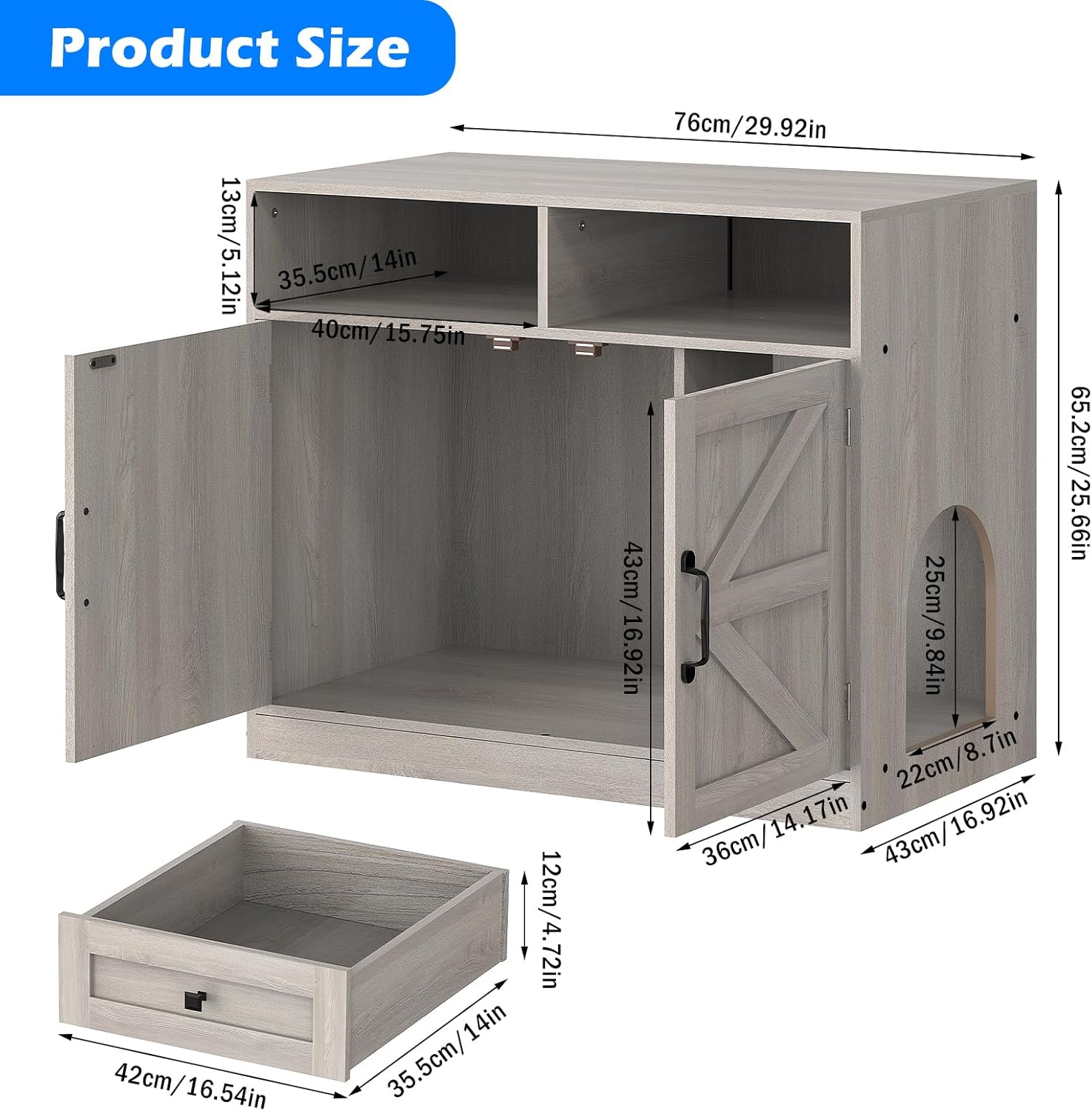 Cat Cabinet with 2 Drawers: This cat litter furniture features external dimensions: 29.92″x16.92″x25.66″ internal that can withstand weights of up to 70 pounds,the upper 2 drawer provides ample space for storing your cat’s gear, magazines, TV remote, and other items.