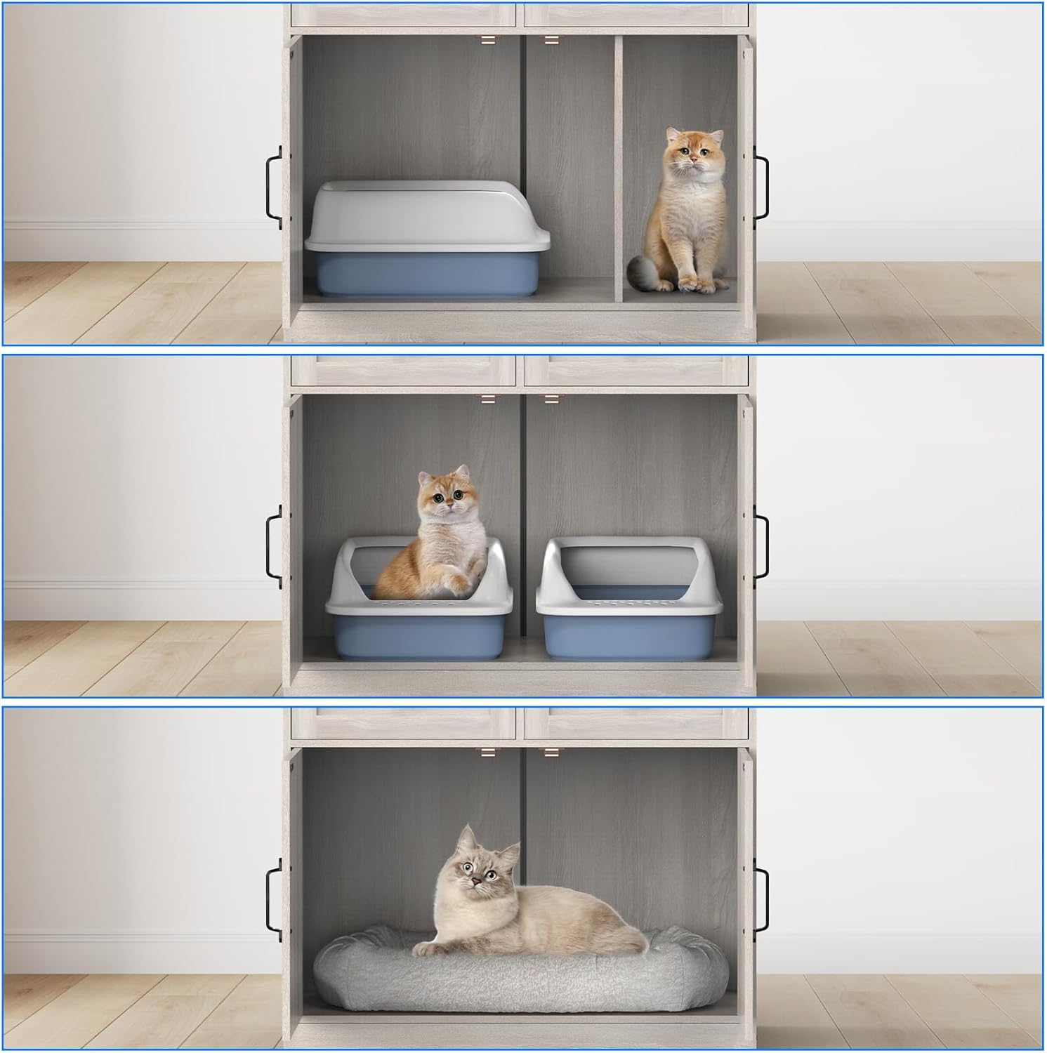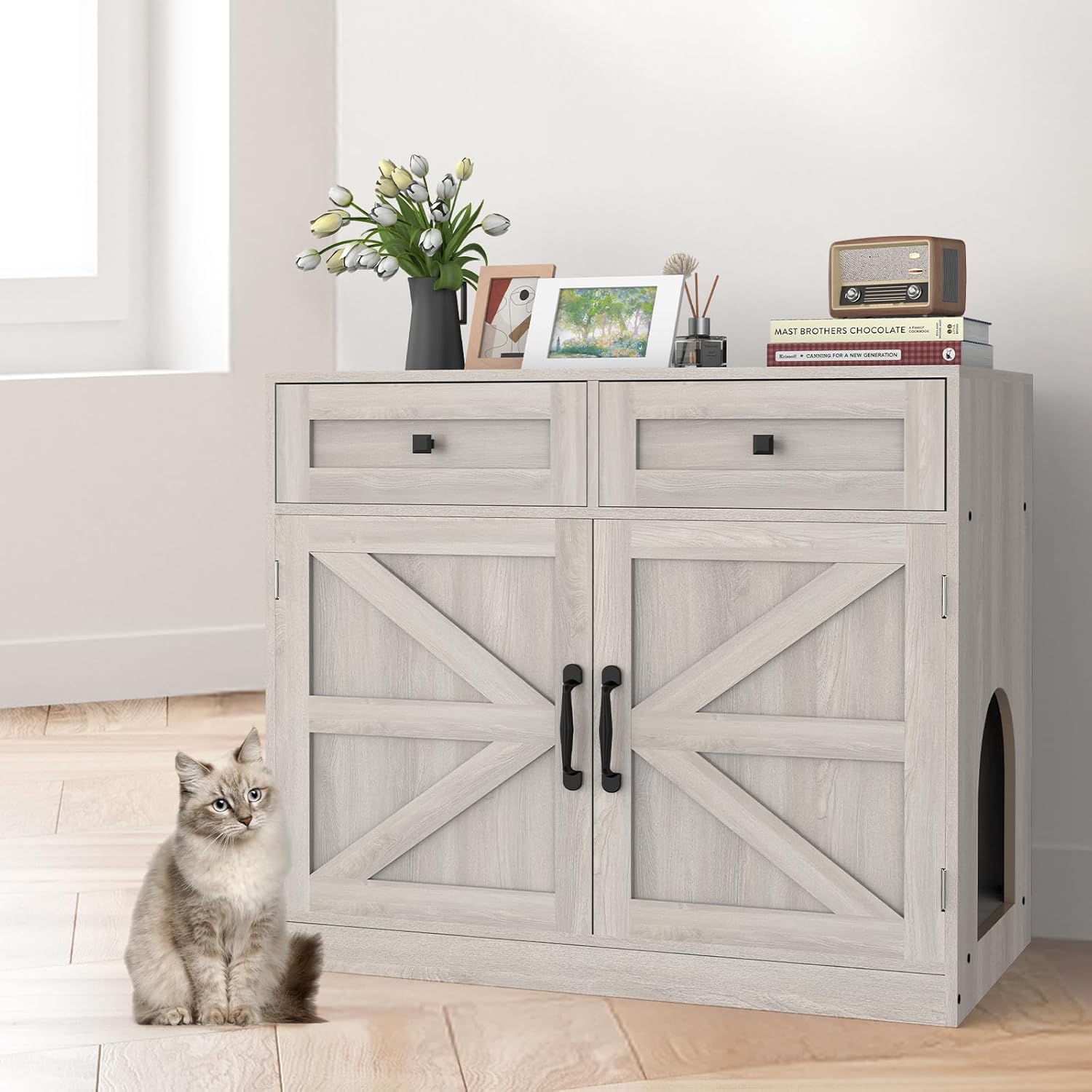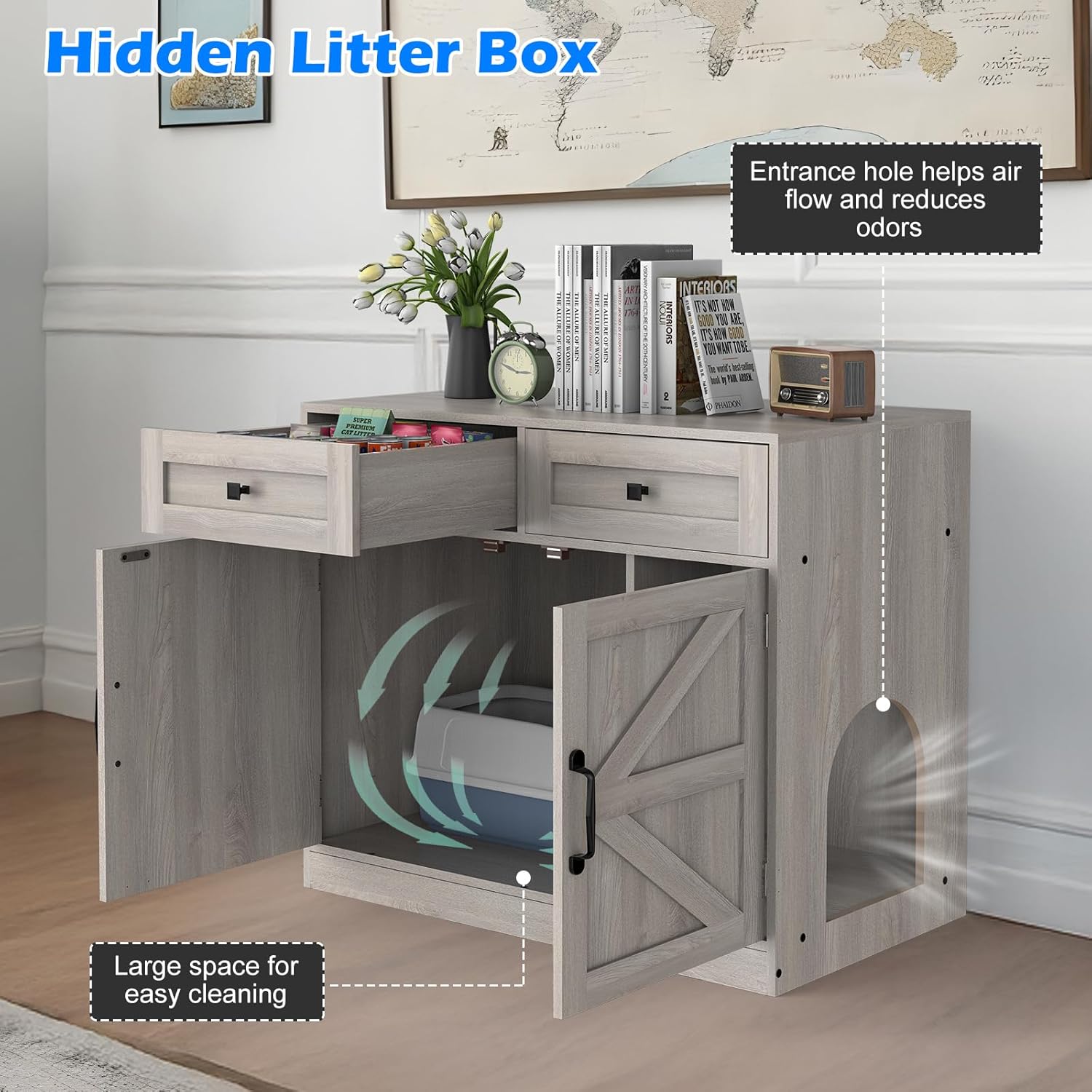 Hidden Litter Box Furniture for Cat Privacy: This unique designed cat litter box compartment provides a private and quiet environment for your cat, while maintaining the cleanliness and aesthetics of your home.