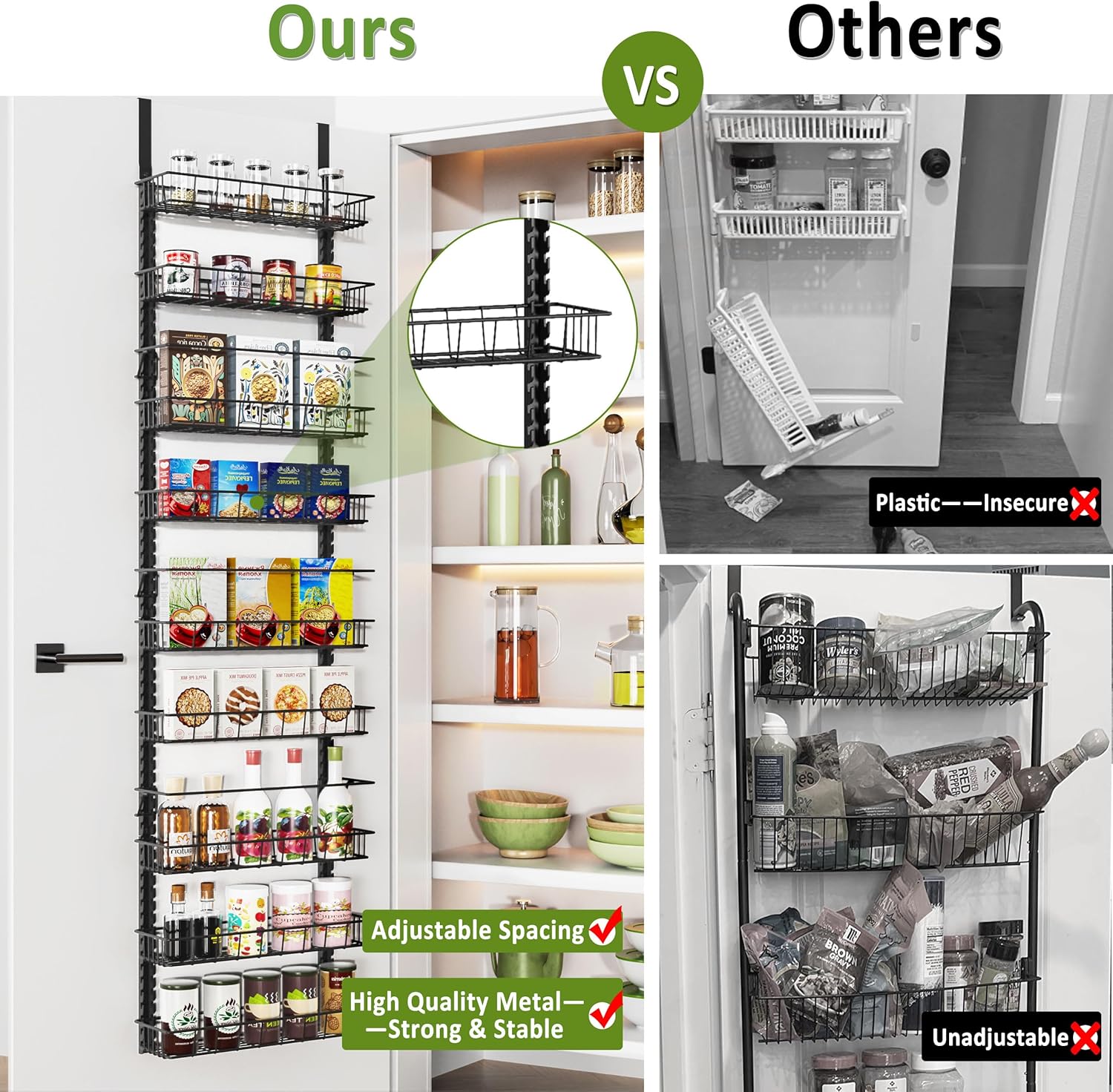 Stable and Reliable: To further increase stability and prevent shaking, we provide double-sided nano tape and screws to connect the pantry organizer rack firmly to the door or wall