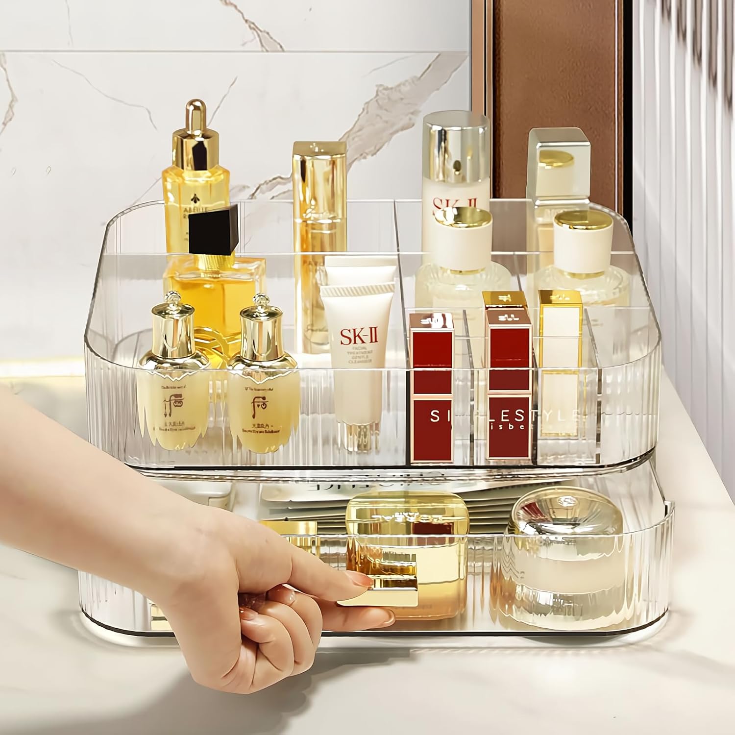 Large-Capacity Storage: This makeup organizer set includes a wide drawer and an organizer top tray has 12 sections to fit cosmetic items of varying sizes.The organizers have ample space for multiple lotion bottles, brushes, facial mask, cotton pad, makeup brush, perfume, lipstick, liquid foundation, mascara, eyeliner, eye shadow palette and other daily cosmetics. Interlocking and stackable design fits to other drawers so that you can DIY your own makeup organizer.