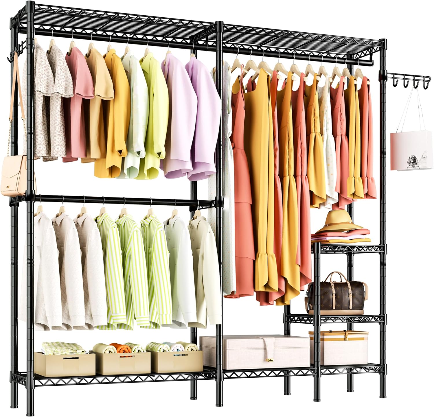 Versatile Multifunctional Clothes Rack: Unlock the full potential of our durable garment rack featuring 3 hanging rods and 4 tiers of adjustable wire shelving and 2 side hooks! Hang suits, coats, pants, shirts, or heavy clothes in various configurations to suit your preference. Designed for convenience and versatility, this rack enhances your storage options, making it perfect for a variety of clothing and accessories