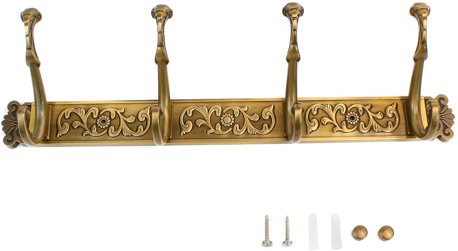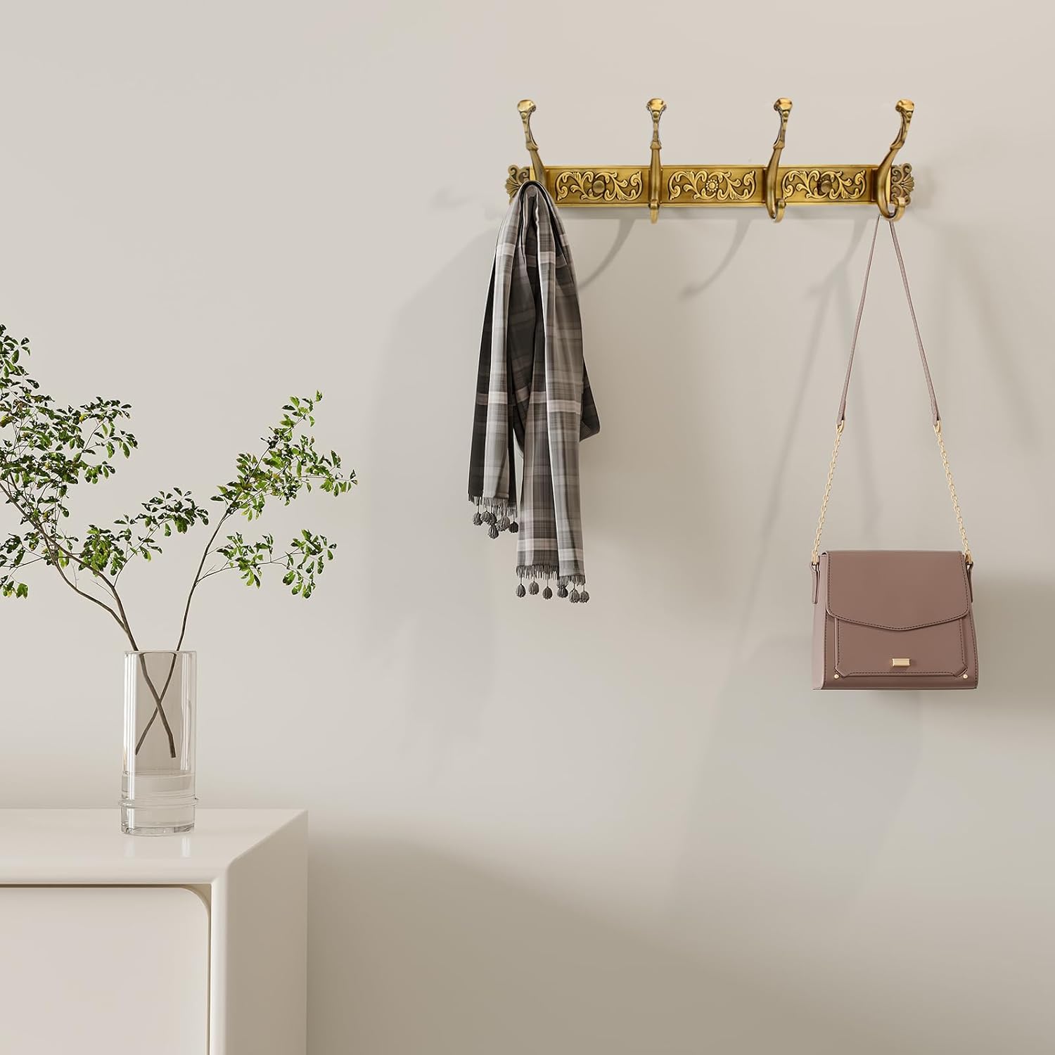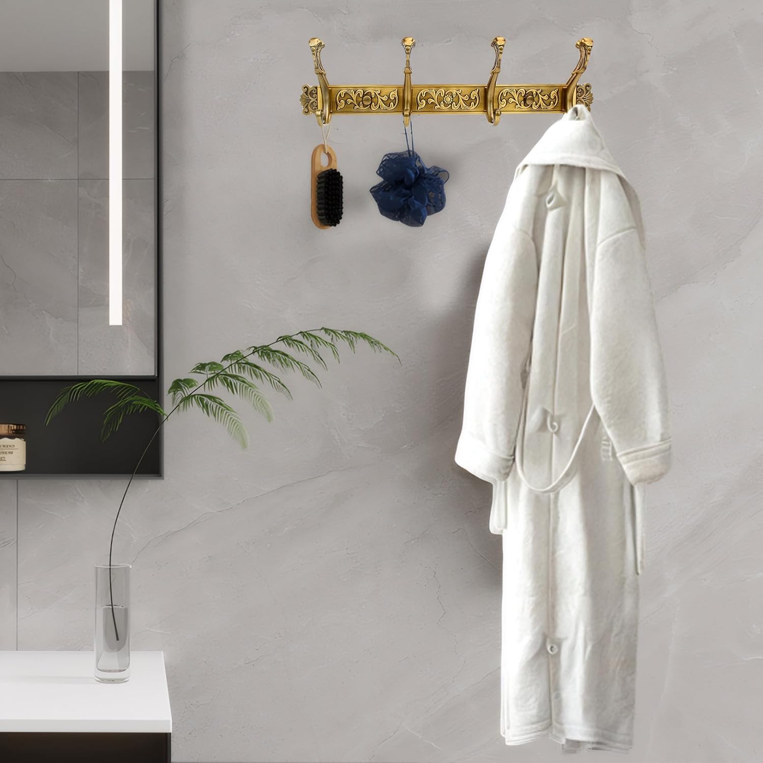 【Vintage Coat Rack】 This coat rack is made with a brushed finish and a timeless design. It has an antique-style, distressed look that resembles aged brass. You can place it in a vintage-inspired room or a modern minimalist home, as it fits well with different styles.