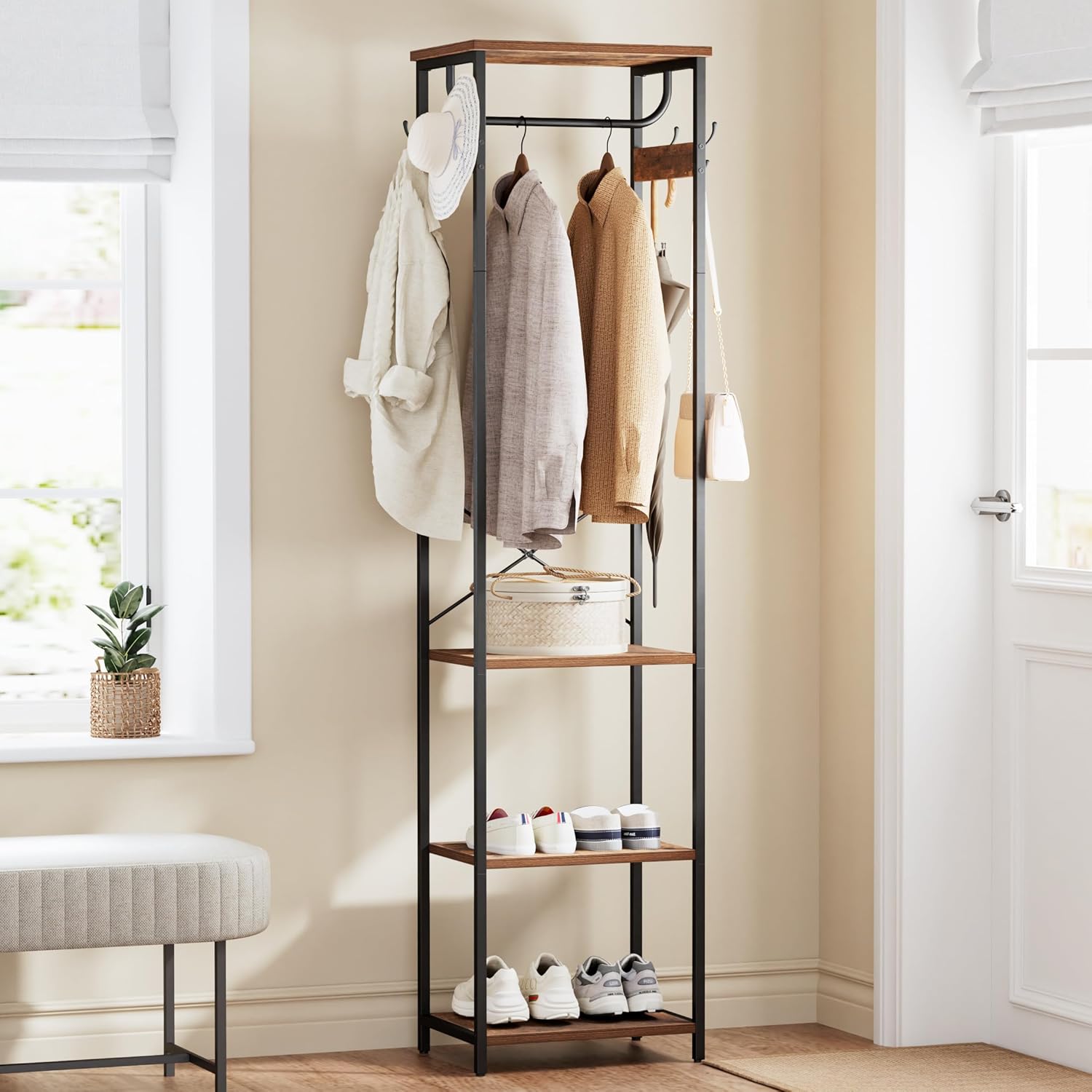 Coat Rack With Hanging Rod, Garment Rack With 3 Wooden Shelves and 4 Hooks, Freestanding Hall Tree, Industrial Clothes Rack Stand Organizer, Rustic Brown and Black