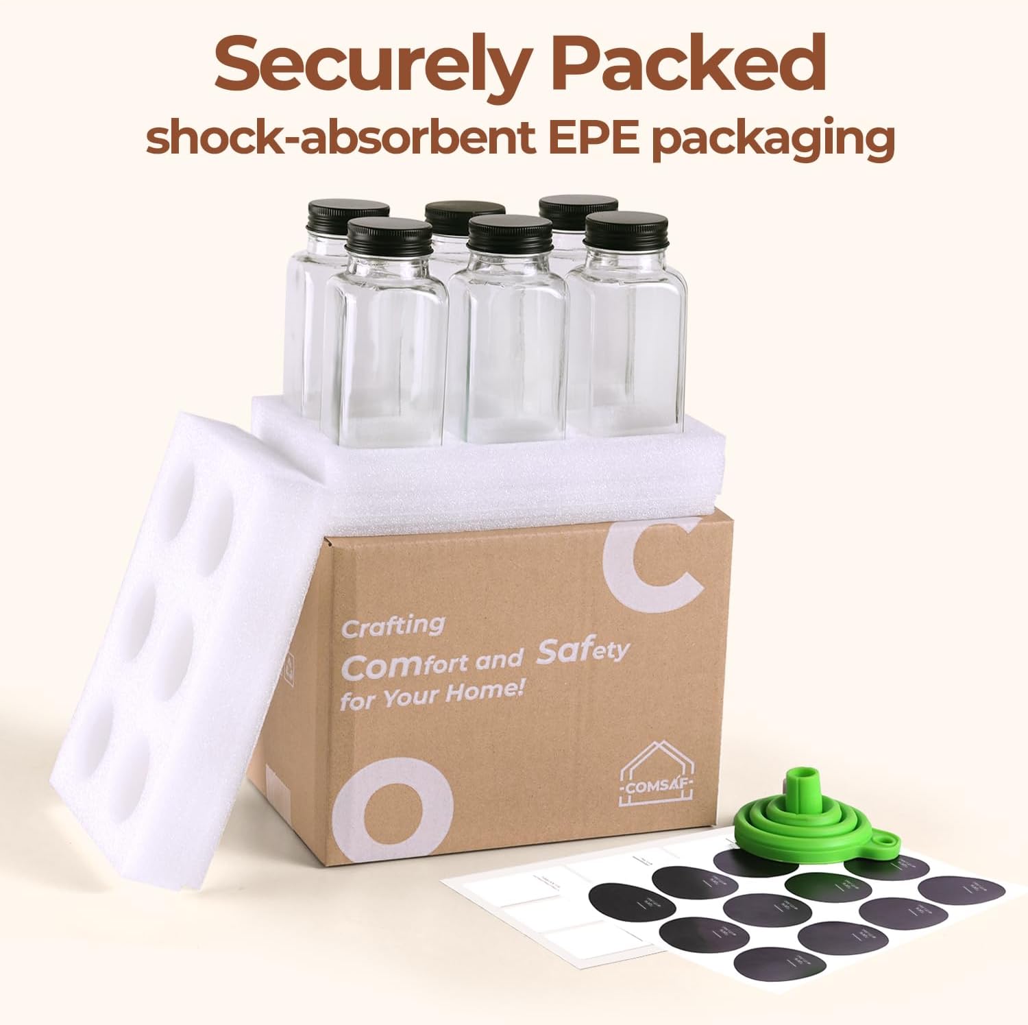 ComSaf Large Spice Jars, 6Pcs 8 oz glass spice bottle with lids, Empty Spice Containers and Square Spice Bottles, Trial Set & Supplement Set for Kitchen and Seasoning
