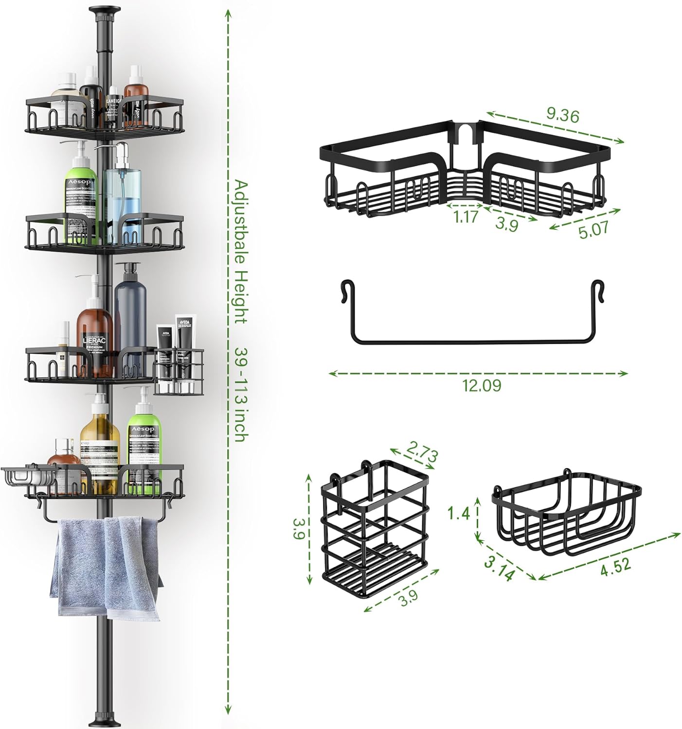 Corner Shower Caddy Tension Pole, 4-Tier Rustproof Bathroom Organizer Storage for Inside Shower Bathtub Shampoo,39 to 113 Inch Adjustable Floor Standing Shelves Black