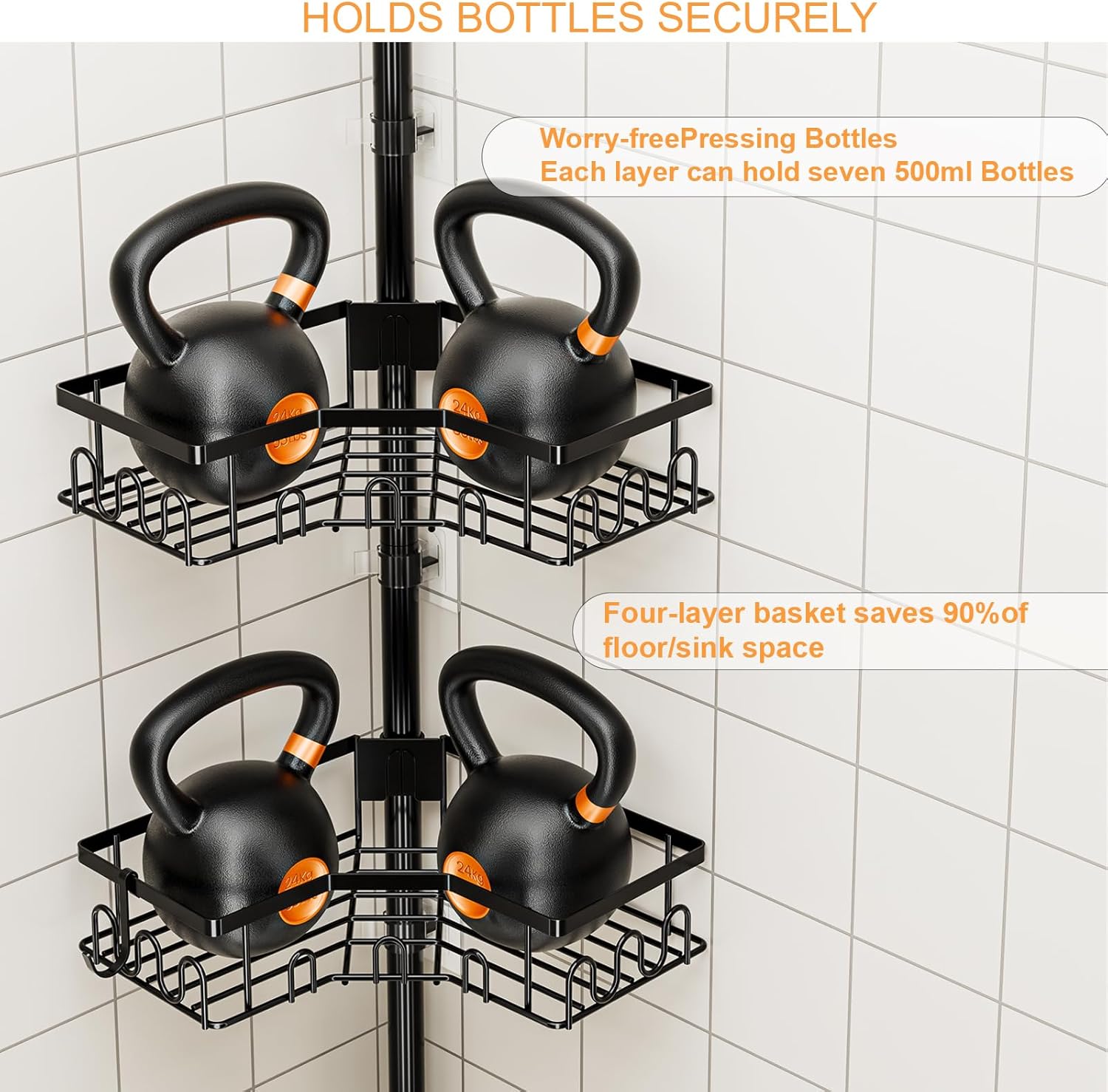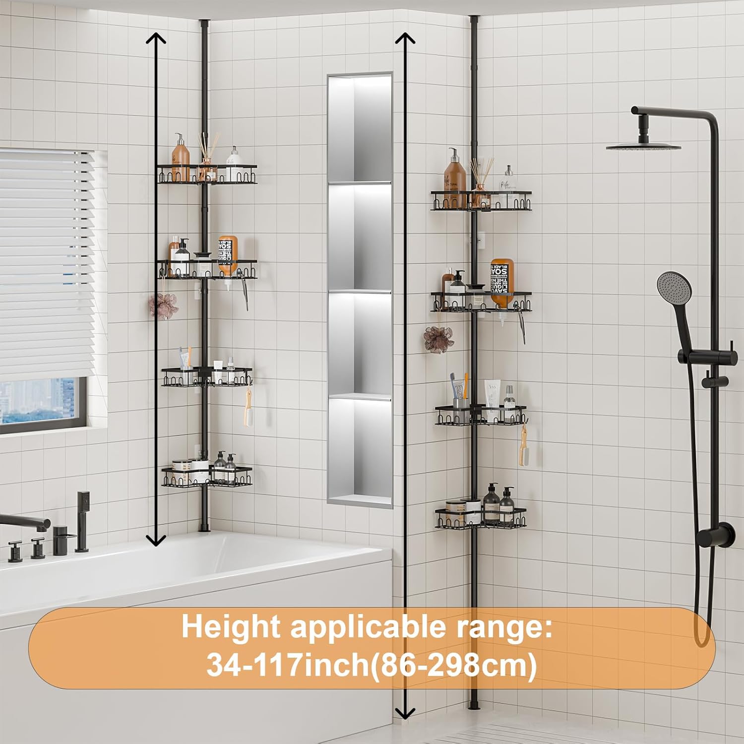 Corner Shower Caddy Tension Pole – 4-Tier Shower Corner Shelf for Bathtub Bathroom Shower Organizer – Adjustable 34in-120in, Space Saving Bathtub Accessory Shelves, Black