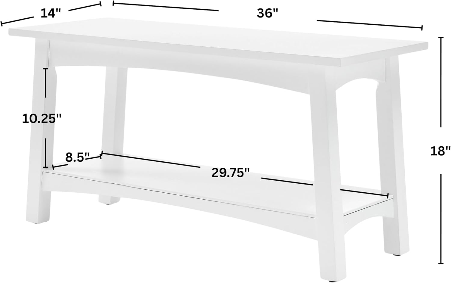PRODUCT DETAILS – Materials: Pine with Composite Wood. Overall Dimensions: (L) 36” x (W) 14” x (H) 18”, Lower Shelf: (L) 29.75” x (W) 8.5” x (H) 10.25. Weight Capacity: 250lbs. Color: White.