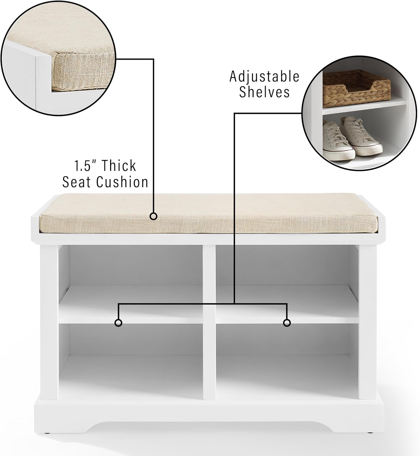 Keep your entryway clutter-free with the Anderson Entryway Bench. Designed for shoe storage, this bench stores four pairs of shoes in perfectly sized cubbies. Two adjustable and removable shelves in the base allow you to add storage cubes or baskets. The Anderson Entryway Bench’s cushioned seat will welcome you as you slip your shoes off at the end of the day.