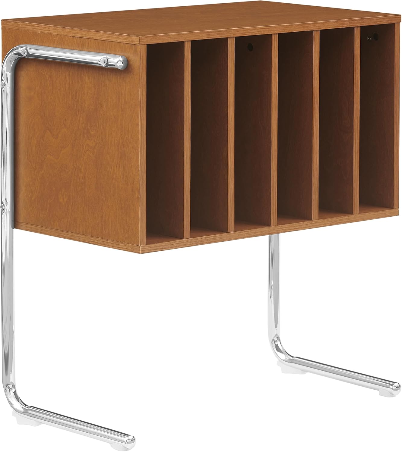 Add a touch of retro charm to your space with the Lily Record Player Stand With Vinyl Storage. It features a warm wood finish and chrome C-shaped legs. The top is perfectly sized for all-in-one record players, while the vertical storage section holds up to 90 records in an upright position. Spin vinyl in your living room or curate a listening corner in your office with this stylish turntable stand.