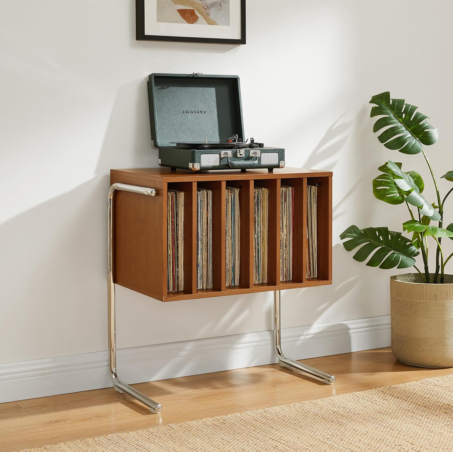 MODERN MEDIA STYLE: Designed with a sleek walnut finish and sturdy steel C-shaped legs in chrome, this record player stand brings a modern edge to your music setup. Its a perfect fit for retro, boho, mid-century modern, or minimalist interiors.