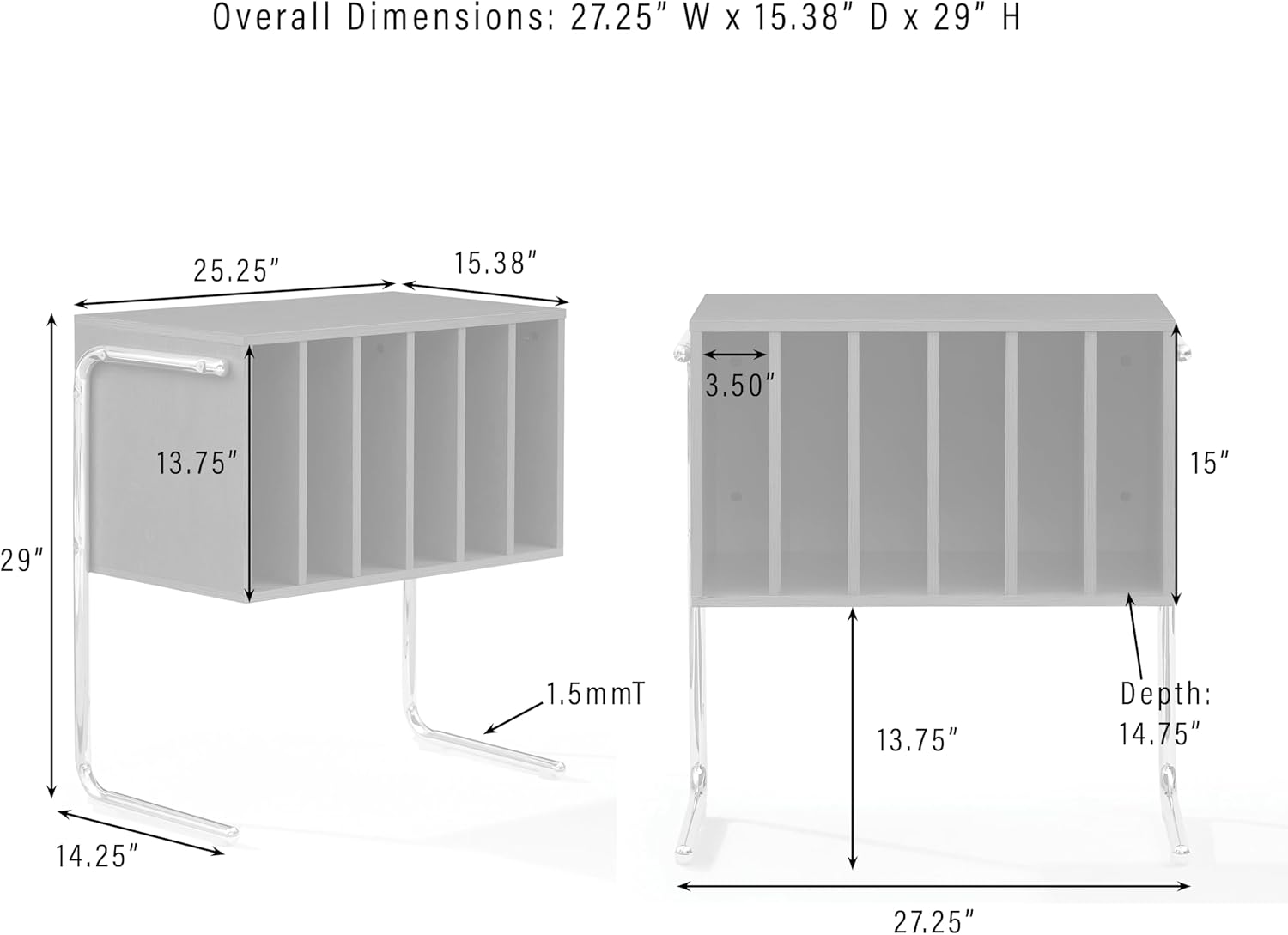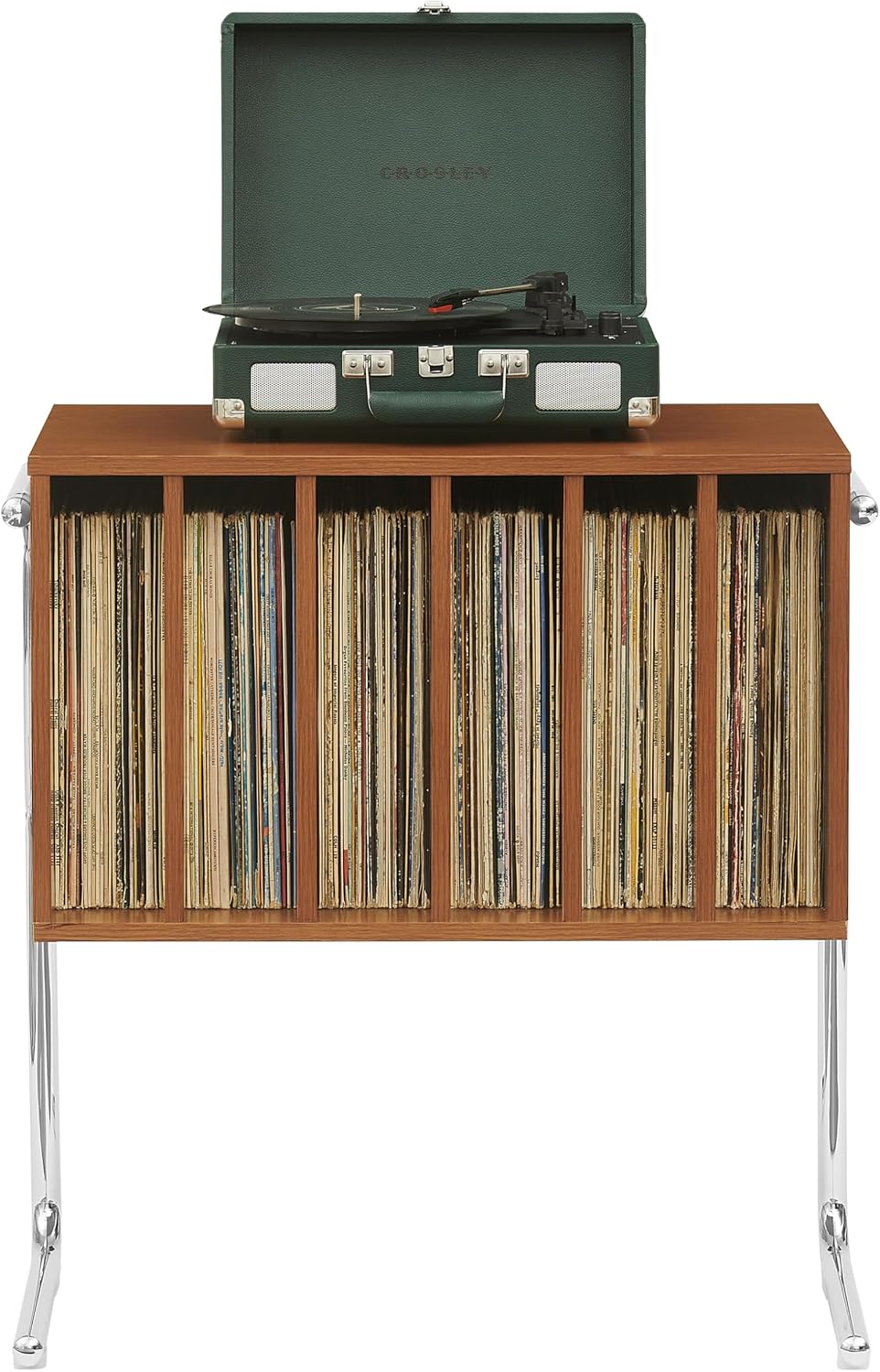 FUNCTIONAL TURNTABLE DISPLAY: The top is sized to accommodate a variety of portable and suitcase-style record players. It has a 25-lb weight limit and rubber feet, ensuring stable and secure storage.
