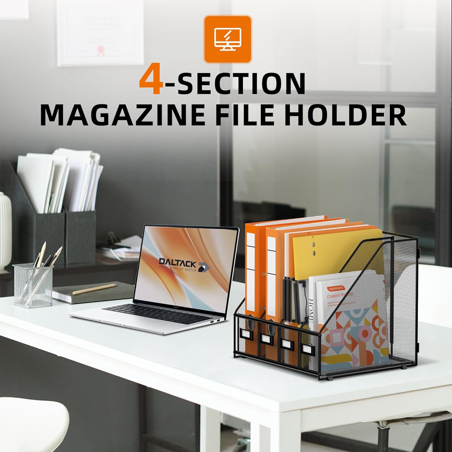 DALTACK Desk Organizers Metal Magazine File Holder with 4 Vertical Compartments Folder Storage Binder Organizer for Office Home School Organization, Black