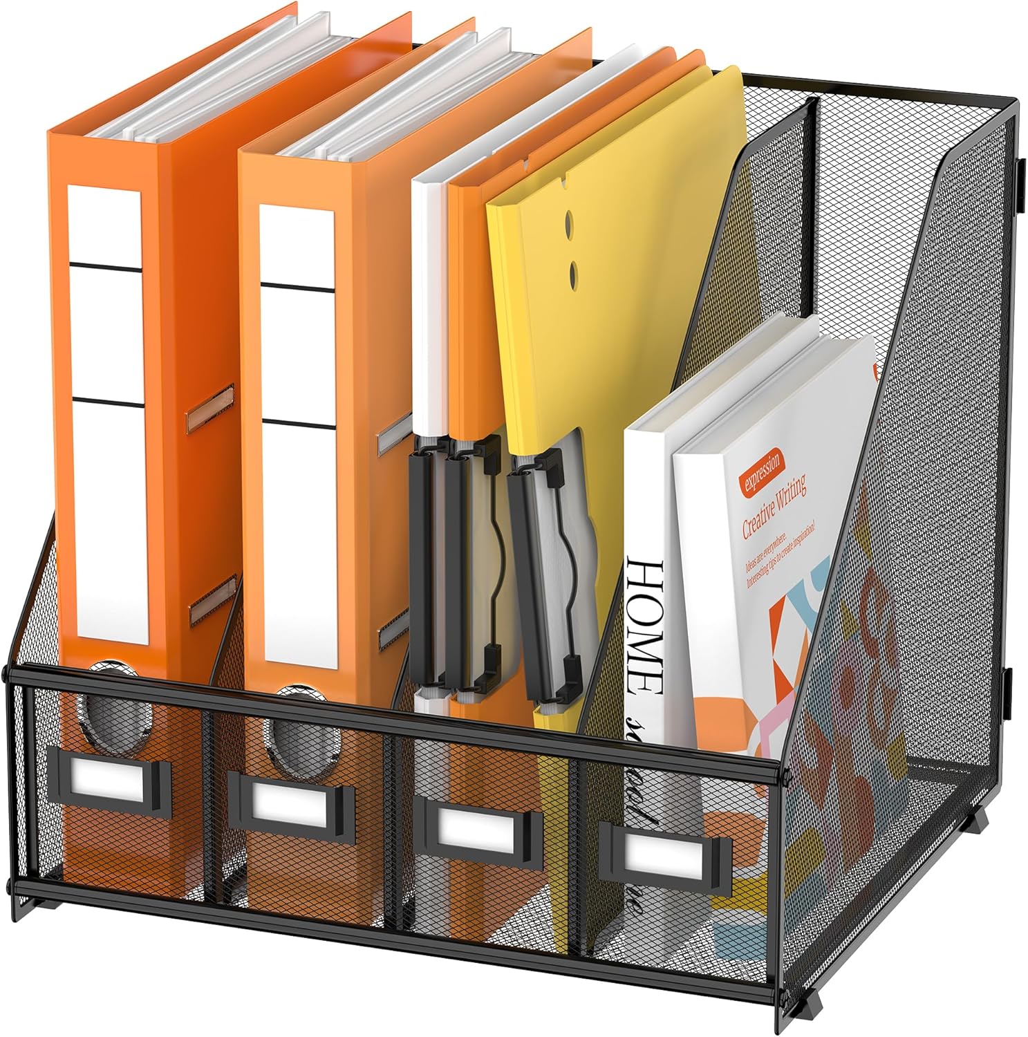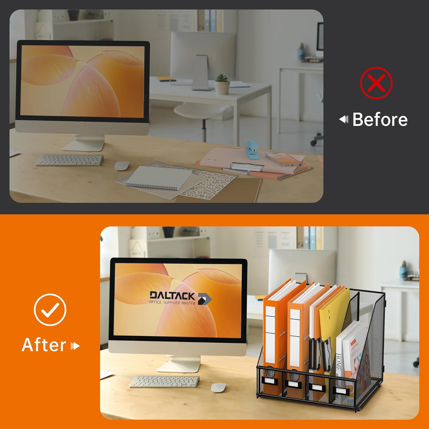 If you are still bothered by your messy desk, DALTACK 4-compartment folder organizer for desk offers you a great solution. This file holder for desk has 4 vertical file holders for desk organization, large capacity and high quality, your ideal chioce for desk organizers and accessories.