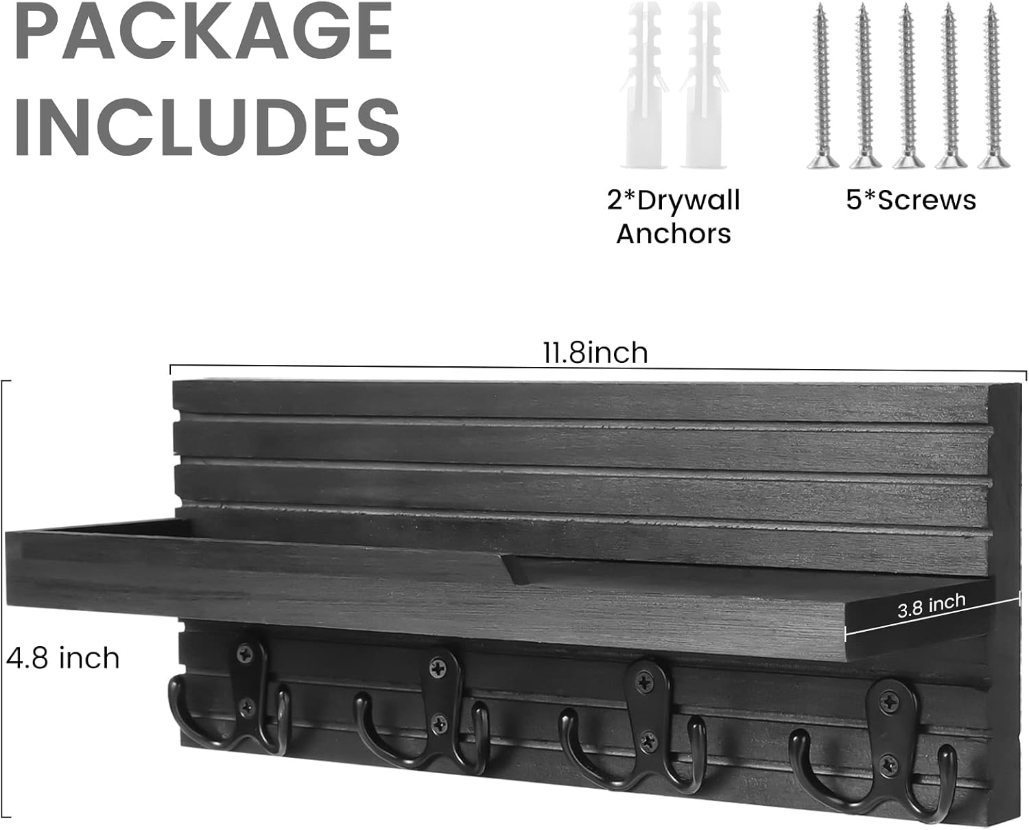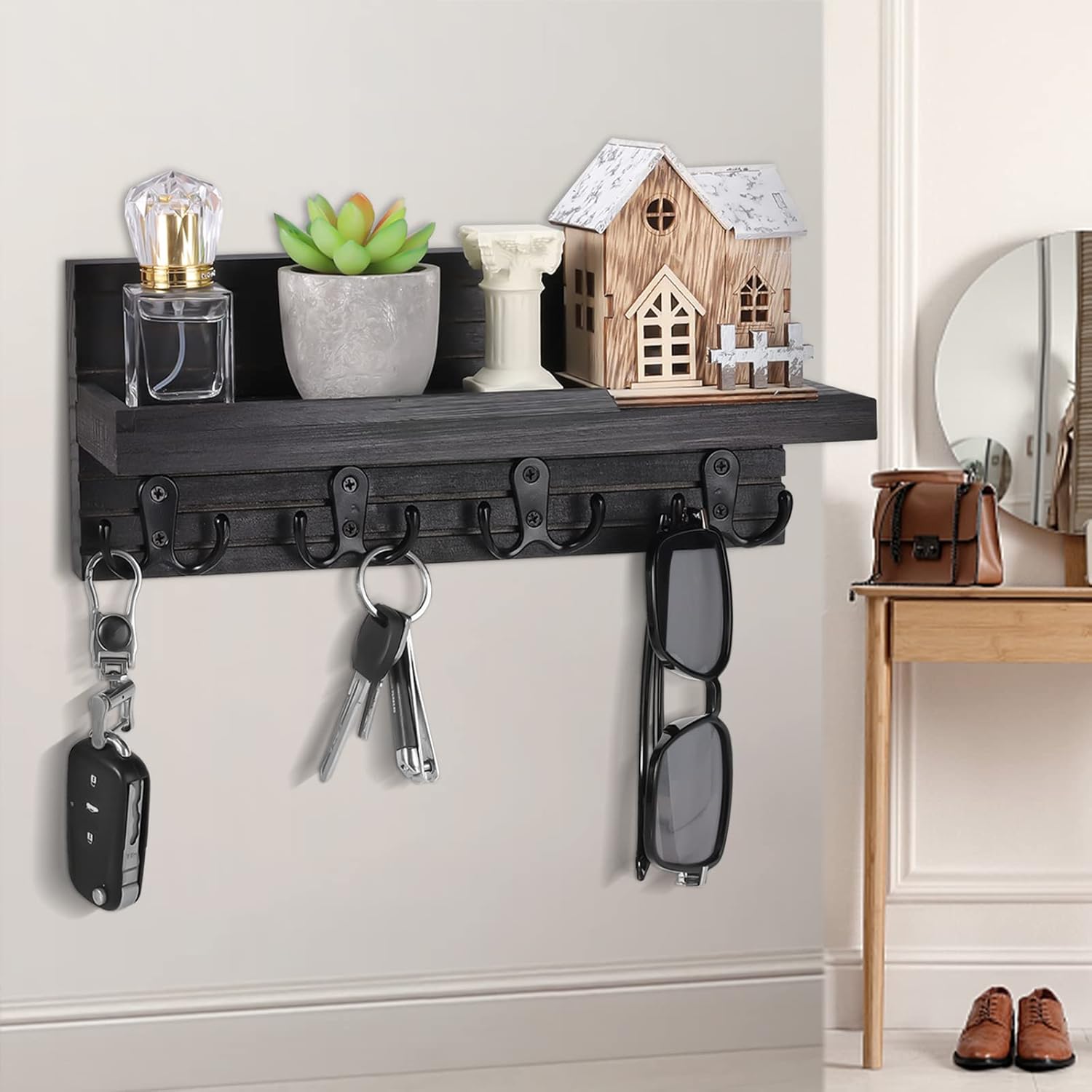 Decorative Key Hanging Rack with 4 Double Hooks – Easy Install Natural Wooden Key and Mail Holder for Wall Mount – Entryway Decor Rack with Shelf (Carbon Black)
