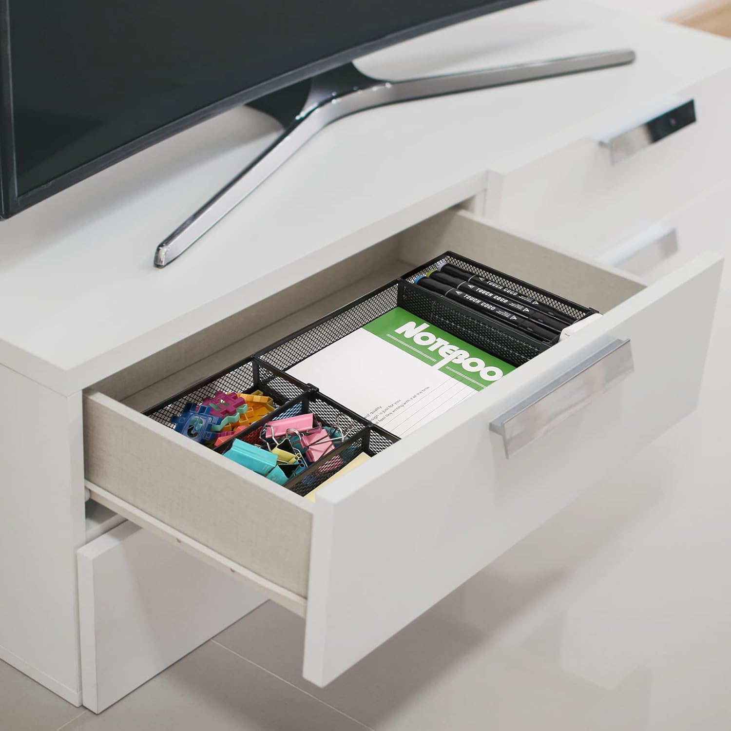 >> Multipurpose Usage Desk Drawer Organizer- Can be used for office or school to organize A5 notebook,brand card, sticky notes, pen pencils,sharpener, ruler, stapler, post-it notes and so on stationery. Also can be use as drawer at home for clip, scissors, tape or cosmetics ,jewelry and so on storage.