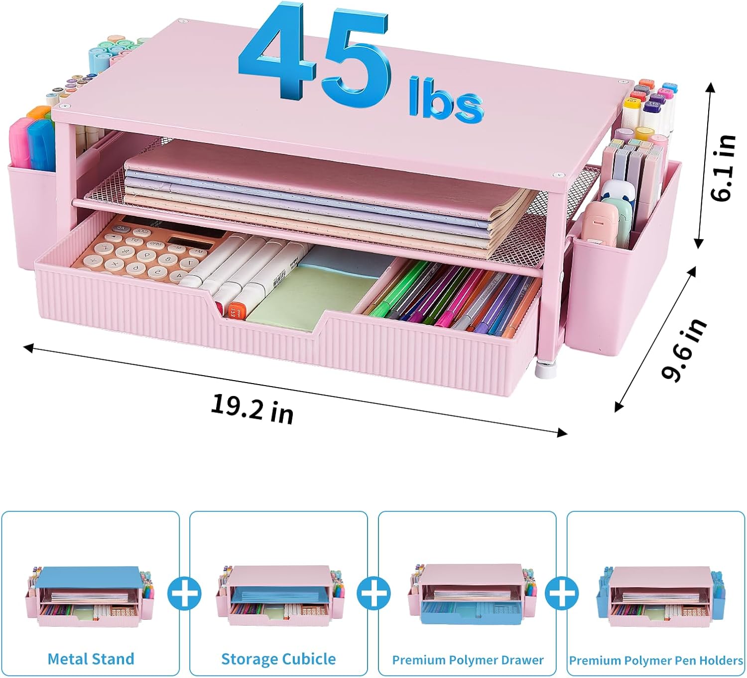 Desk Organizer and Accessories, 2-Tier Computer Monitor Stand Rise with Storage Drawer & 2 Pen Holders, Laptop & Printer Stand for Desktop, Workspace Organizers for Office Supplies (Pink)