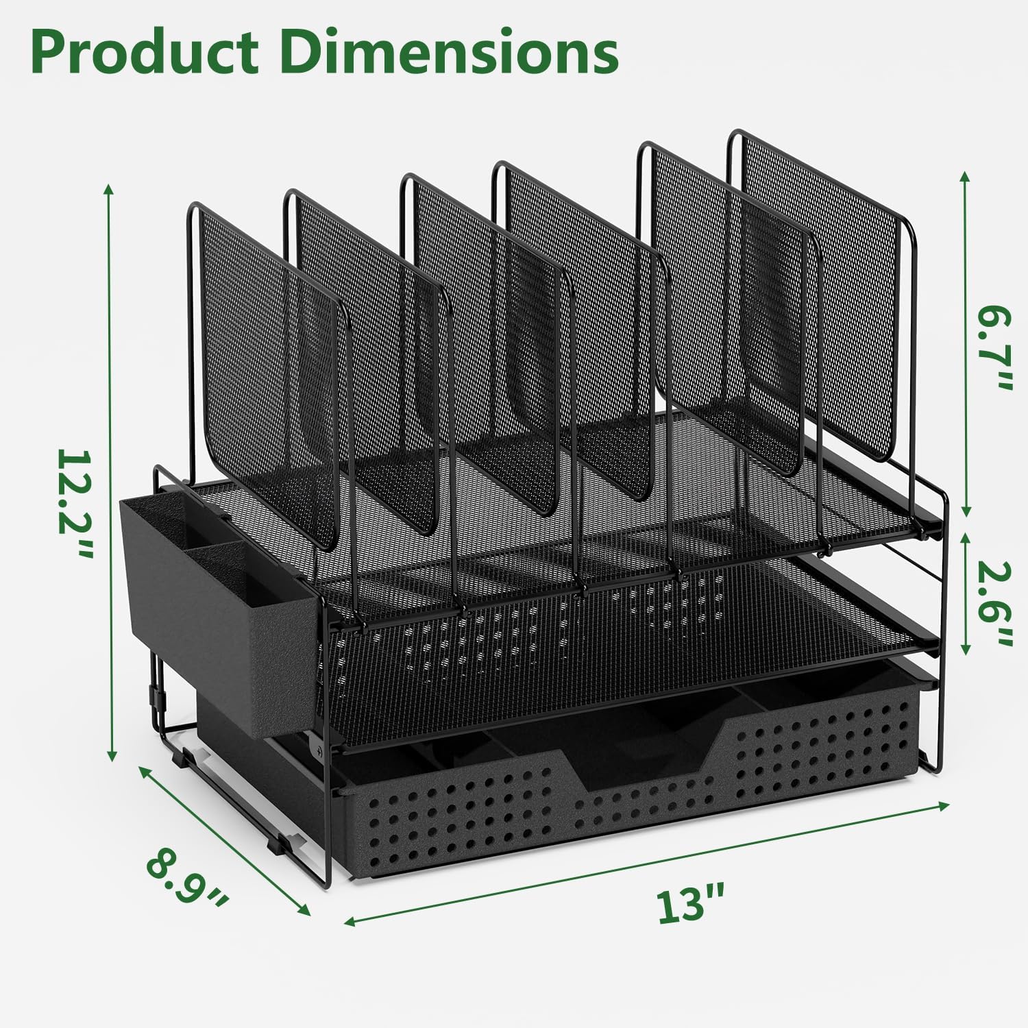 { Large Storage Capacity } You can organize your files and documents in the trays and the vertical file holder, together with all your office supplies in the drawer, and pens and markers in the pen holder. The desk file organizer provides you a perfect desk organization solution, creating more desk space for you to work more efficiency and more productive