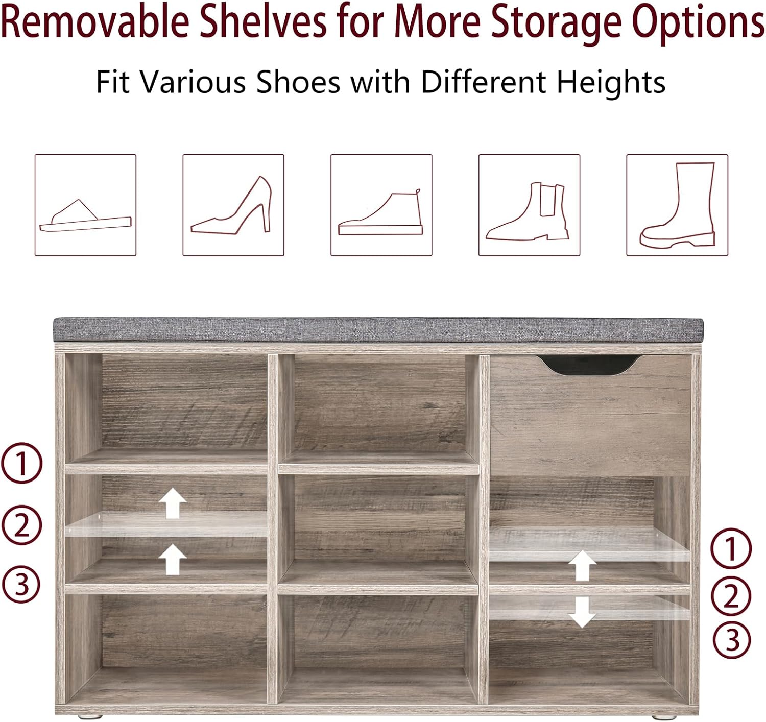 【Adjustable Shelves for Multiple Needs】3 middle compartments are fixed size for sneakers, high heels and sandals. Shelves on both sides of the entryway bench are adjustable to 3 heights for storing slippers, boots or baskets. A perfect storage solution to store blankets, books and toys