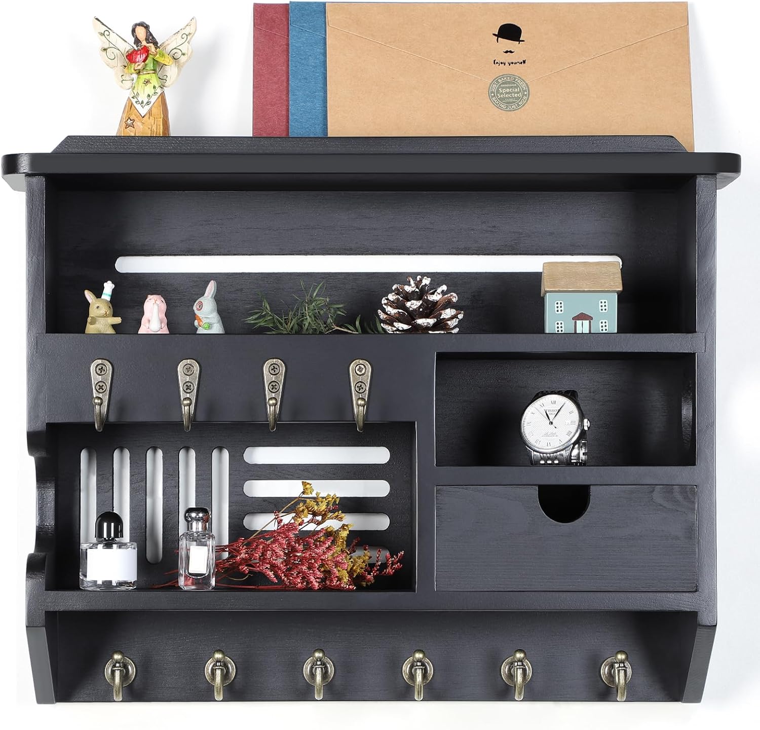 DOPACE Key Holder for Wall, Mail and Key Holder, Mail Organizer Wall Mount with Storage Drawer and 10 Hooks, Easy Installation Keys Holder on Wall, Black