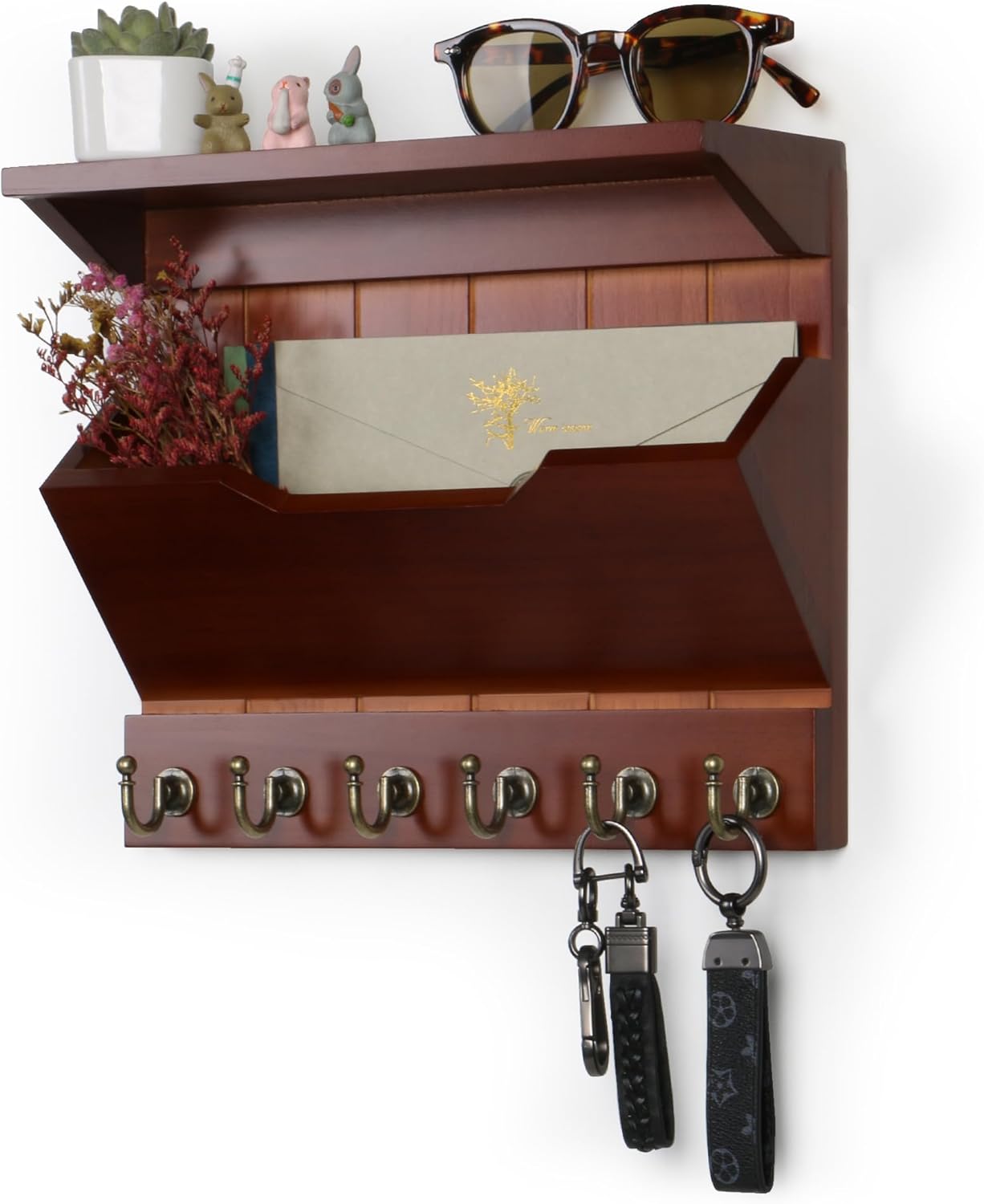 DOPACE Key Holder for Wall, Mail and Key Holder, Mail Organizer Wall Mounted with 6 Key Hooks, Pine Wood Auburn