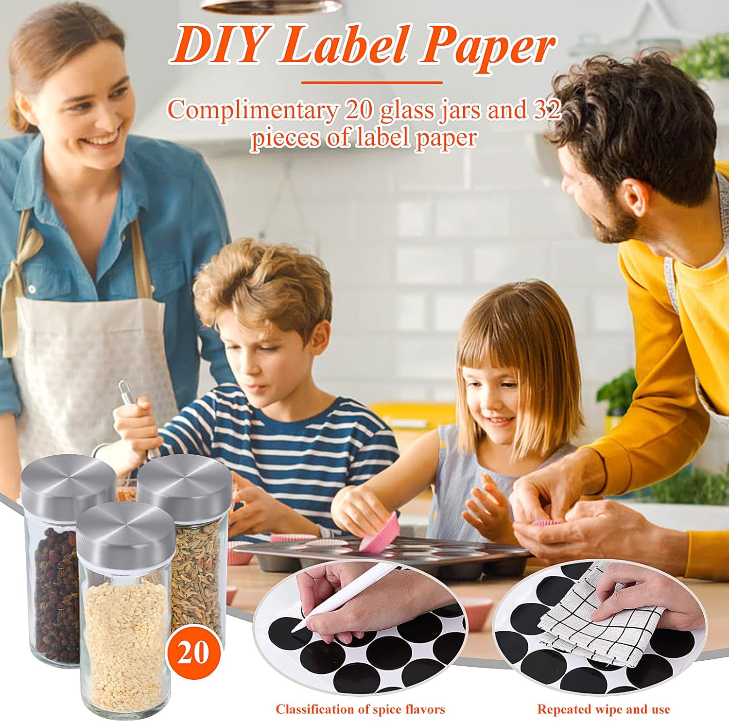 【Pre-printed & DIY Lable Stickers】The seasoning organizer is equipped with 144 pre-printed labels, 36 blank labels and a DIY white marker to label each spice. You can mark the seasonings and spices what you put on each glass bottle, which is convenient for you to identify and find.