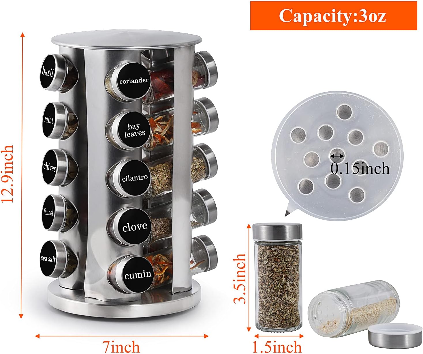 【Safe & Durable Material】Our revolving spice rack with jars is made of high quality stainless steel, strong and durable. The glass jar is made of lead-free glass, which is safe and secure to store the spices, and the transparent jar body is convenient for observing the spices.