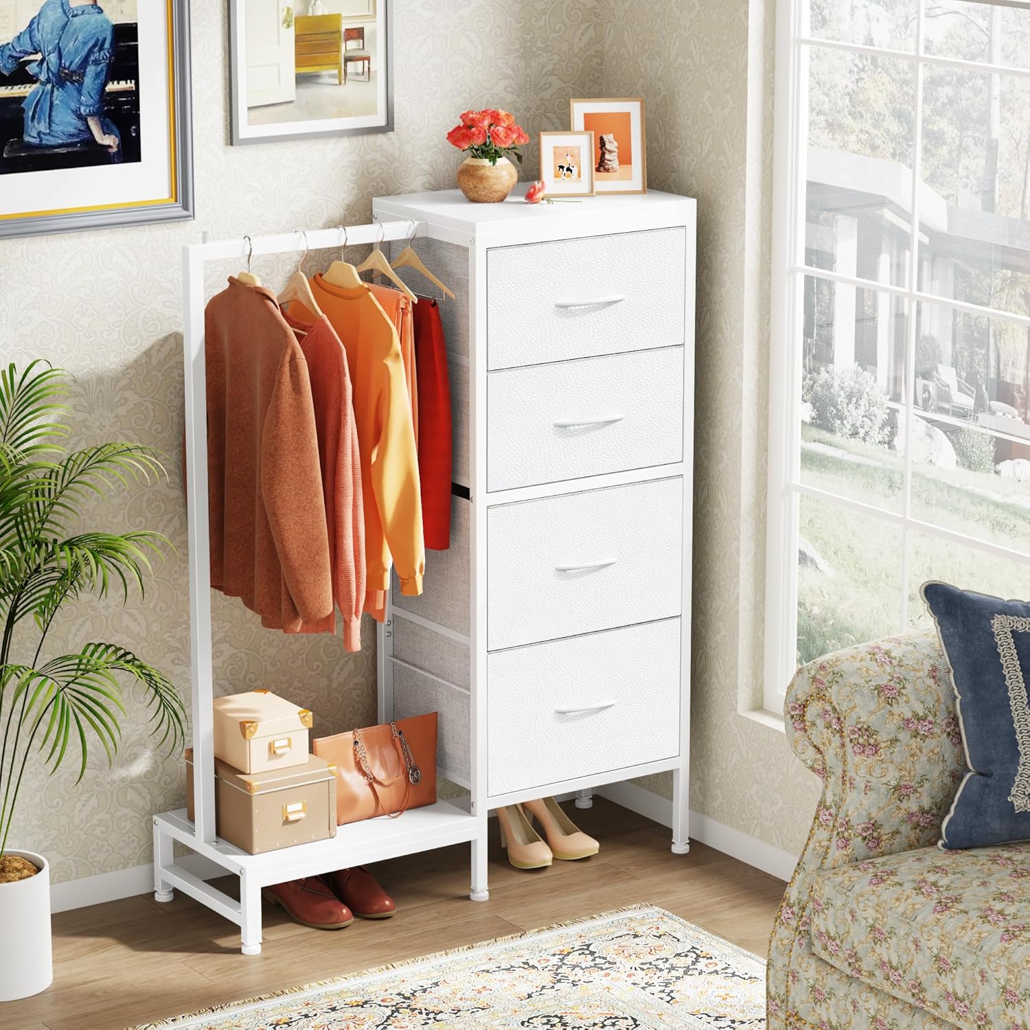 Dresser with Hanging Rack, 4 Drawers Small Closet for Bedroom, Reversible Fabric Chest of Drawers with Clothes Rack, Tall Storage Tower, Sturdy Frame, White, 44”H