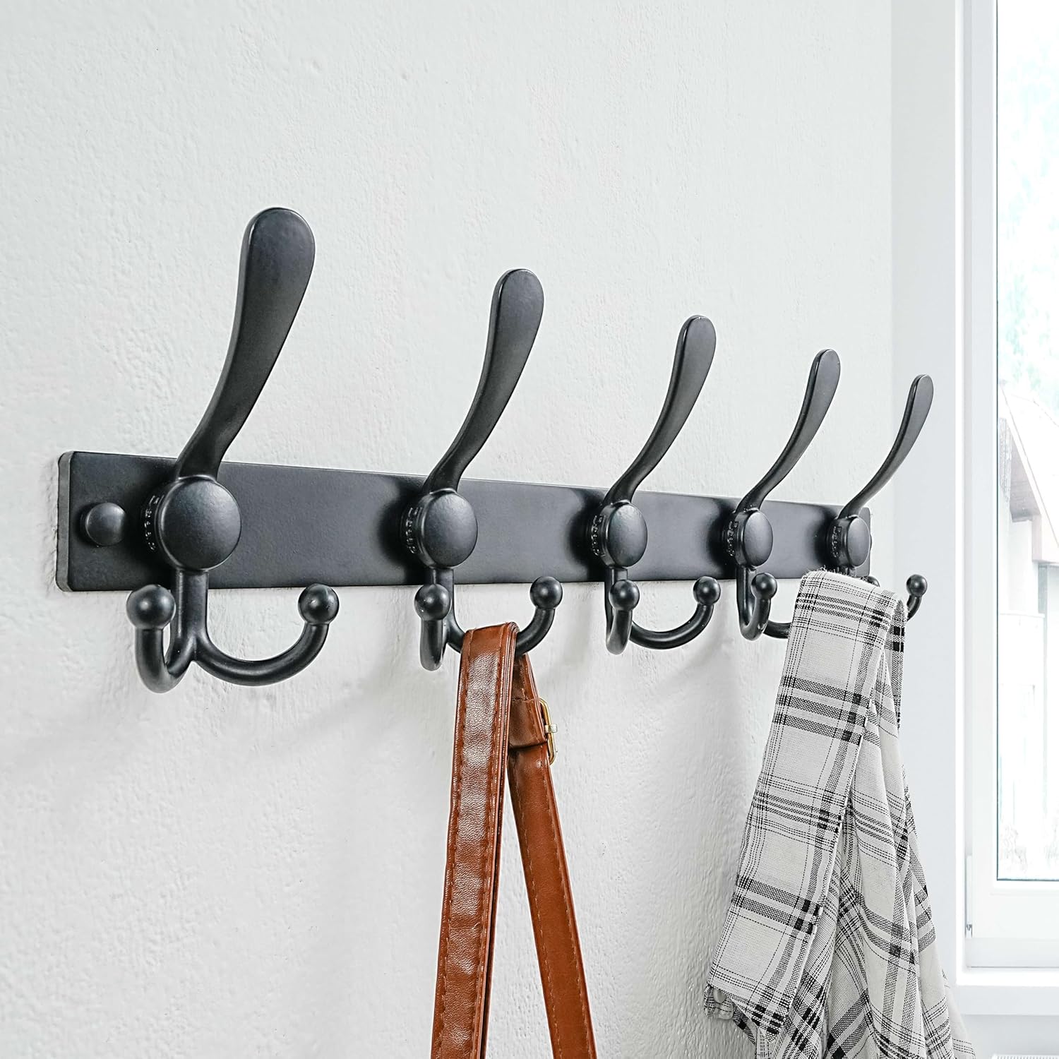 【5 Tri Hooks, 100+ Uses】 Space-saving wall coat hanger for entryways,closets, Holds 15+ coats, hats, towels, jackets,backpacks. Size: 17″ x 5-1/8″x 2-1/4″. 1 x hook rack, hardware included, black