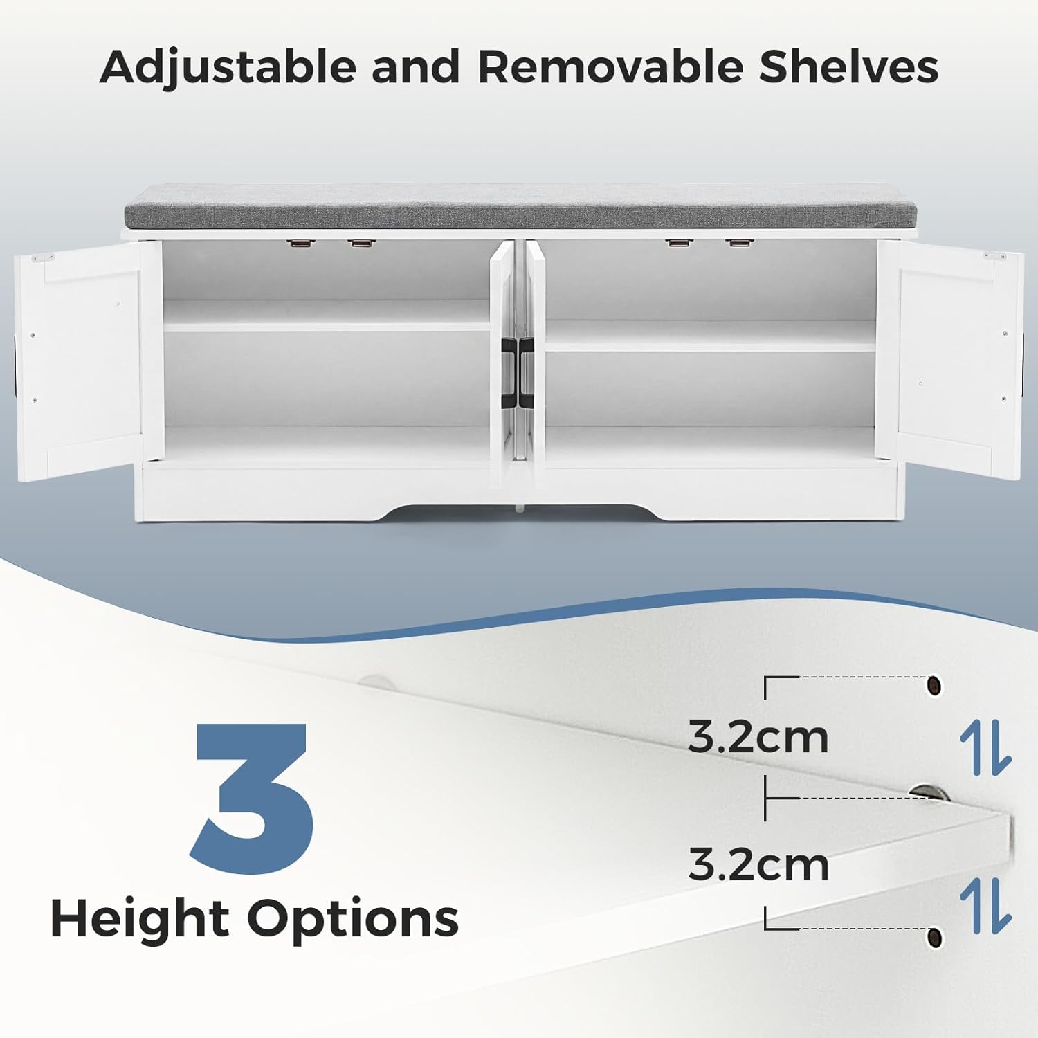 DUMOS Shoe Storage Bench, 47″ Wide Shoe Organizer Cabinet with Padded Seat Cushion, 4 Doors, Adjustable Shelf for Entryway, Hallway, Bedroom, Living Room, White