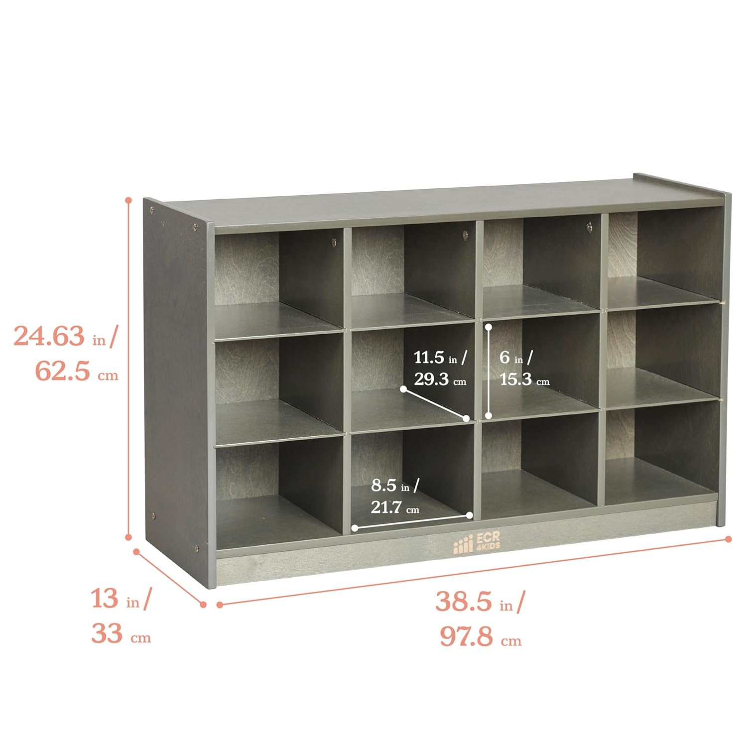 Product Dimensions: Organizer measures 38.5″ W x 13″ D x 24.63″ H; individual cubbies measure 8.5” W x 11.5” D x 6” H; Adult Active Engaged & Direct Supervision Required