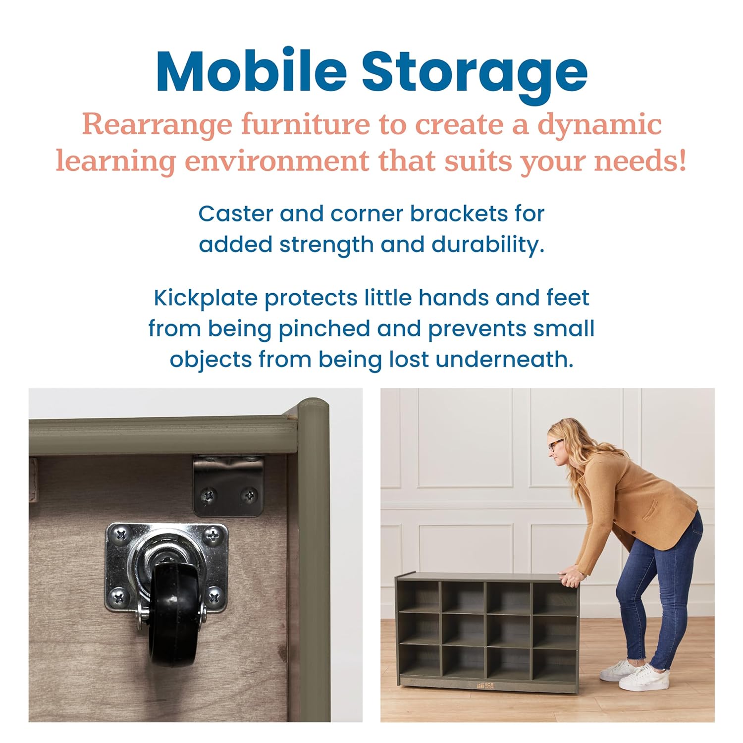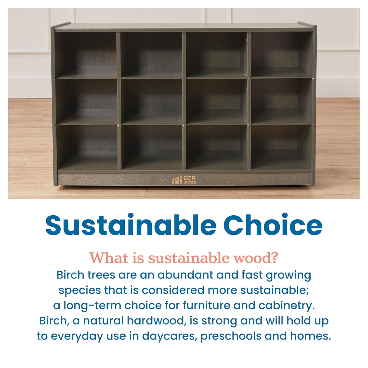 Keep your classroom or home uncluttered with the ECR4Kids 12 Cubby Mobile Tray Storage Cabinet. Ideal for small spaces, adults and kids can organize and store toys, games, building blocks, and school supplies that may otherwise be forgotten. Designed to grow with little ones, this storage cabinet helps parents, teachers, and educators keep small items within reach. Give children their own separate cubby at school to store art projects, homework, and personal belongings. Pair with ECR4Kids Scoop Front Storage Bins to keep little things contained and off the floor; bins are sold separately. The low-profile open-face shelves encourage children to select their favorite activity independently, introduce organizational skills, and clean up when playtime is over. Four casters are included for mobility: moving the storage unit from a hallway to the art room. Constructed from sustainably harvested birch plywood with a durable finish sealing the wood surface and resisting scratching. A UV inhibitor helps furniture resist ultraviolet light and yellowing. Natural birch plywood is extremely durable and will hold up to everyday use in an early childhood environment. Combine the Montessori storage with other ECR4Kids Birch Collection furniture pieces to complete the space.