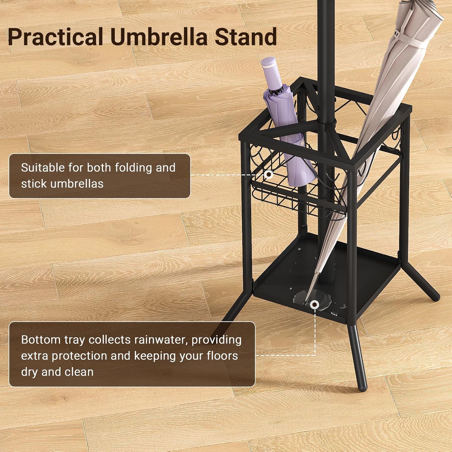 Space-saving Design: Perfect for small spaces, our coat stand effectively maximizes your storage space while keeping your entryway or bedroom neat and tidy. The umbrella holder is suitable for both folding and stick umbrellas, and the bottom tray is designed to protect your floors from rain water damage and keep it dry and clean
