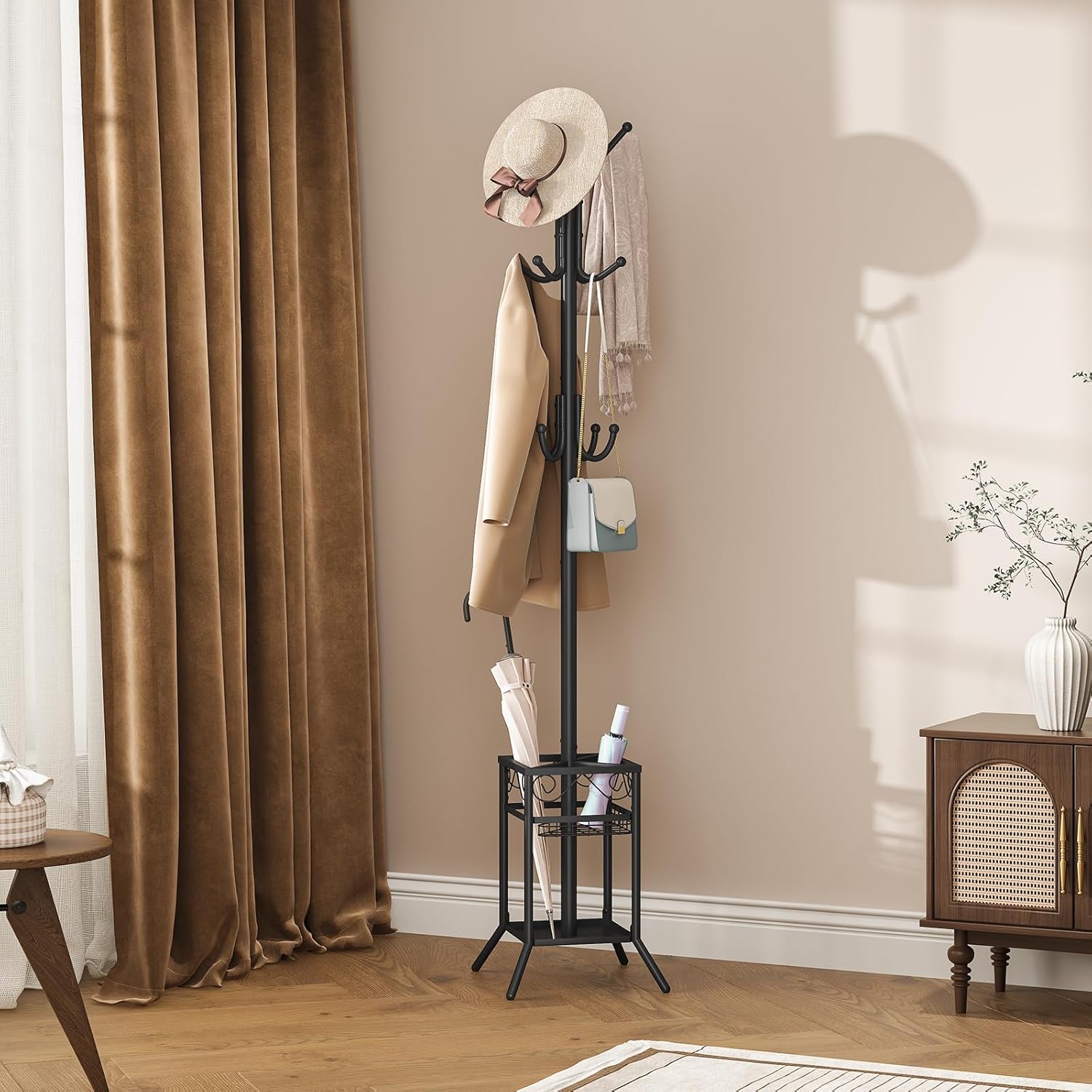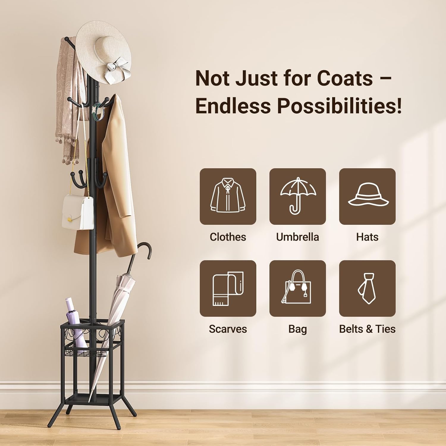 Stylish & Functional: This coat rack with umbrella holder not only serves as a chic coat hanger stand but also enhances any space. Available in three elegant colors, it seamlessly fits into your hallway, foyer, closet, bedroom, office, or any corner needing an organizational touch