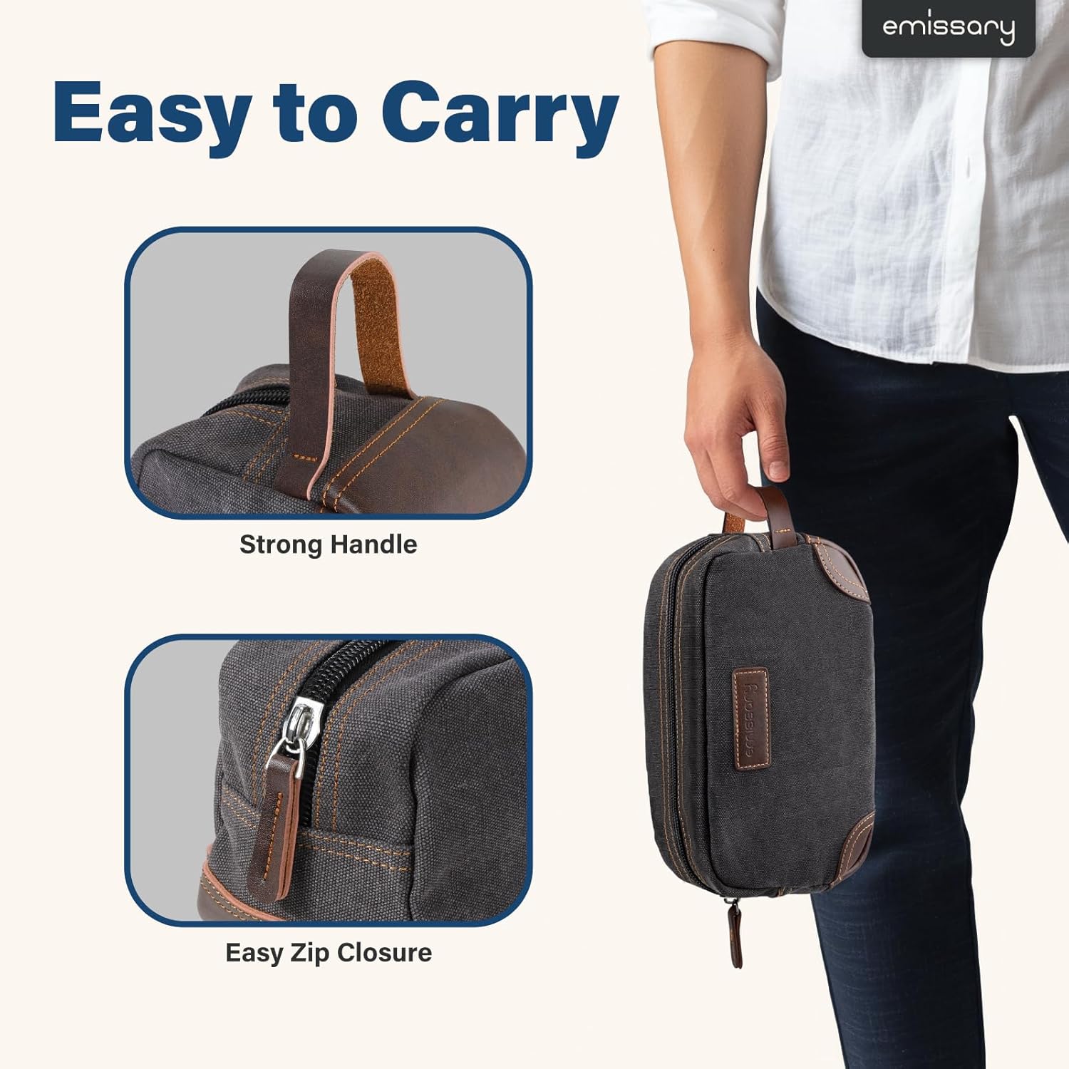 HIGH-QUALITY DURABLE MATERIAL: This exceptional toiletry travel bag by emissary is made of canvas and PU leather, which is known for its lightweight yet durable qualities, the perfect combination for traveling. This specific material is water resistant, making it safe for use in environments where it may become wet. Making this the perfect bathroom bag, shaving bag, and travel dopp kit.