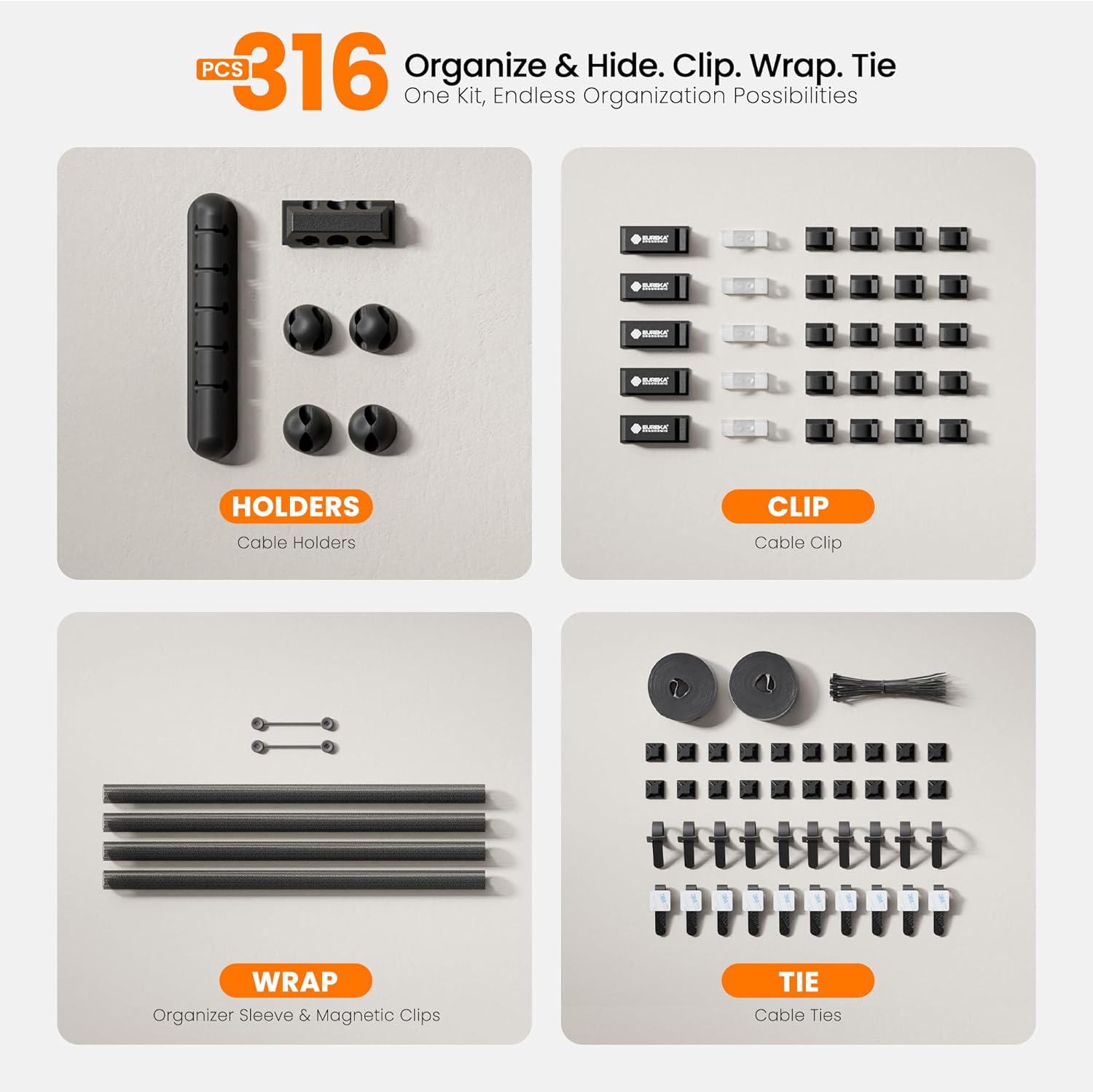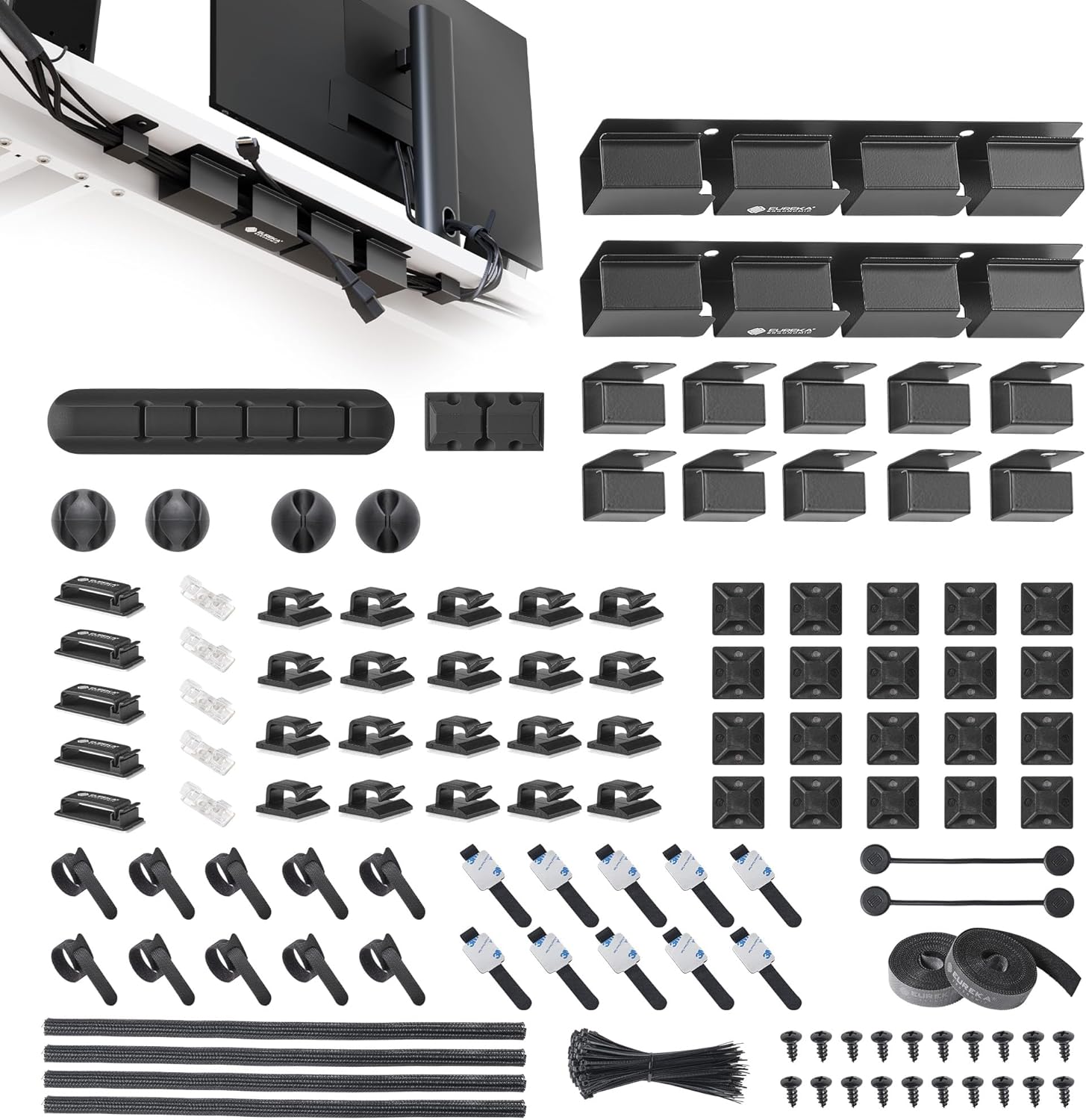 EUREKA ERGONOMIC Metal 316 PCS Cable Management Organizer Kit Cable Raceways, 6 Cable Holder, 4 Cord Sleeve, 60 Wire Clips, 2 Roll Self Adhesive Wire Ties, 100 Zip Ties Under PC Desk, Black