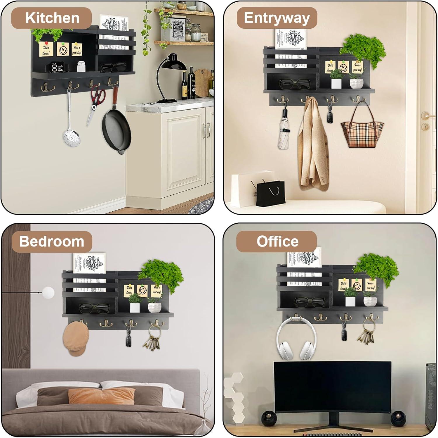 ”Transform Clutter into Charm” More than a key rack – it’s your personal command center! The mail organizer shelf holds sunglasses & AirPods, while 8 hooks keep keys visible. Pro tip: Style the open shelf with mini succulents or framed family photos for instant farmhouse flair.