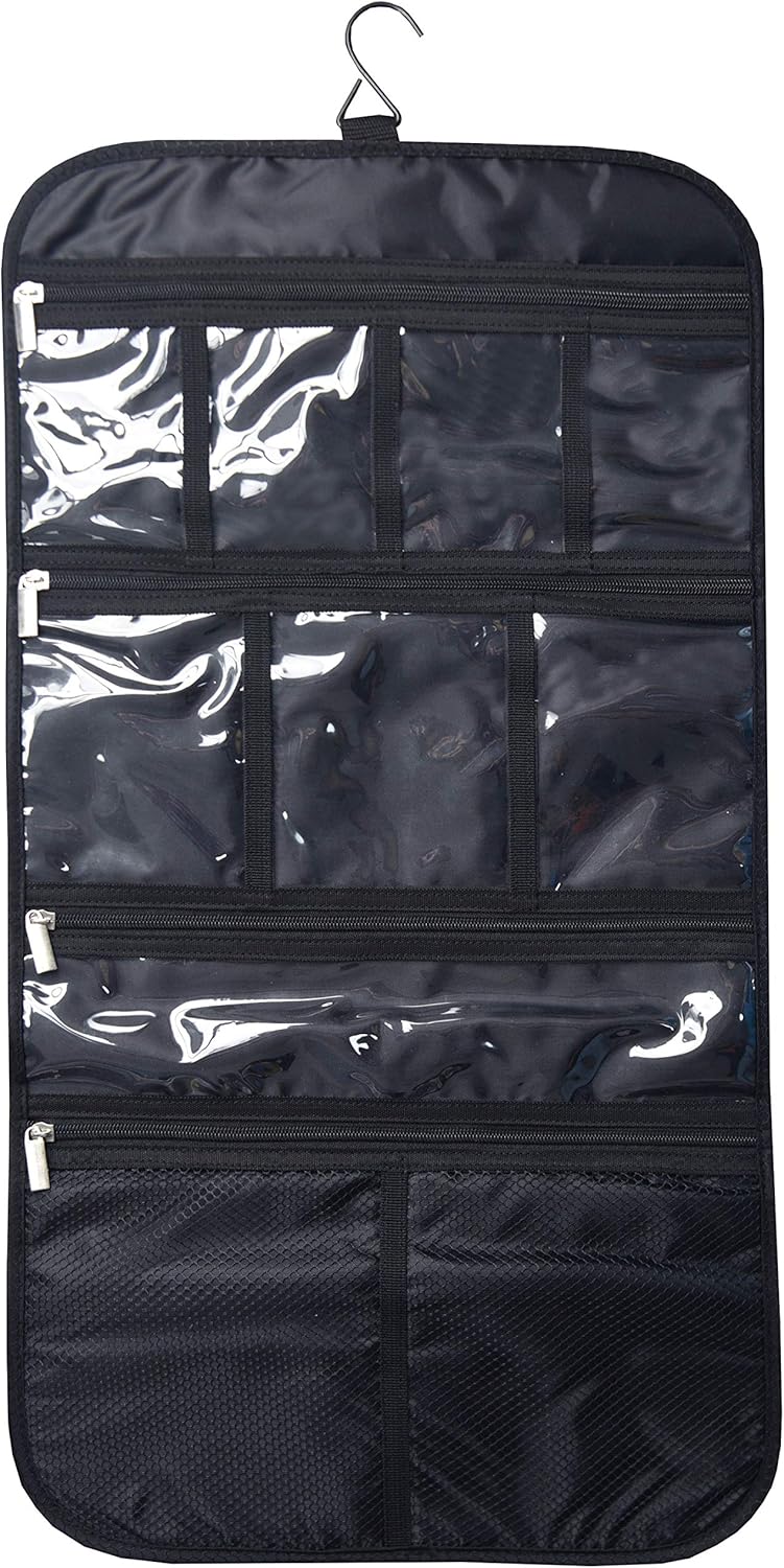 This 13.78” x 9.84” thin & lightweight nylon toiletry bag can be unfolded to twice that size and hanged from its built-in durable metal hook to offer you better access to its many pockets and compartments.