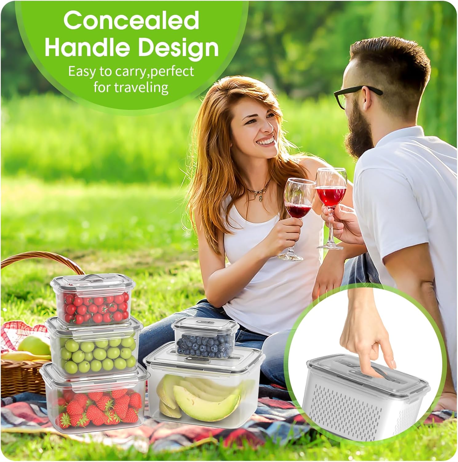 5 Sizes to Meet Your Storage Needs: Fruit containers for fridge with 5 different sizes (ranging from 13 oz to 140 oz). With colander you can easily wash fruits and vegetables by just soaking and draining. Berry containers for fridge great for storage brussels, meat, fish, lettuces, celery, berries, strawberries, blueberries, salads, bacon, etc