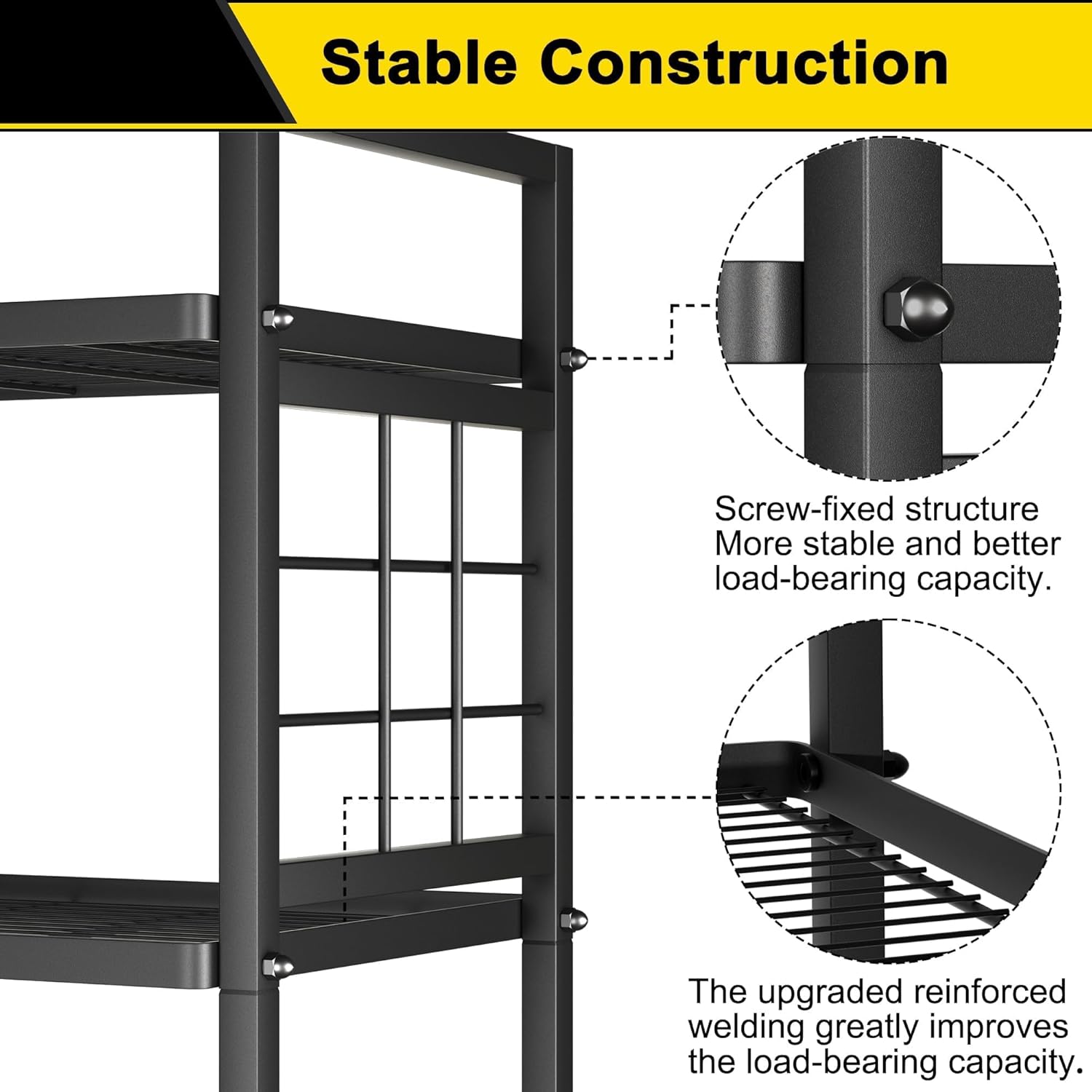 STABILITY STRUCTURE: Made of strength steel tube, this sturdy metal shelf can hold up to 120 lb on each layer; specially coated for protecting it from any water, rust or corrosion and very easy to clean.Suitable for damp environments such as kitchens, bathrooms, laundry rooms, etc.