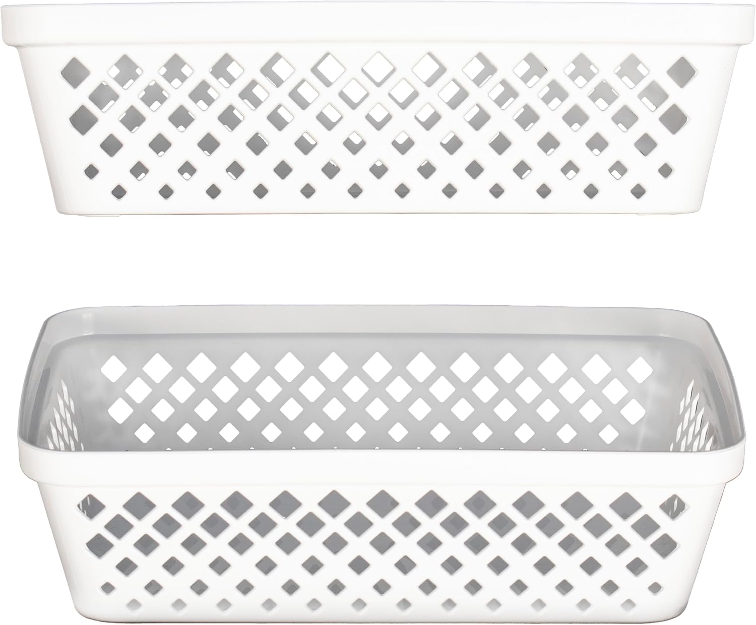DURABLE & LIGHTWEIGHT – Decorative storage baskets are easy to move and designed to last. Bathroom storage containers boast a sturdy yet lightweight plastic build, decorative diamond design, and neutral white color.